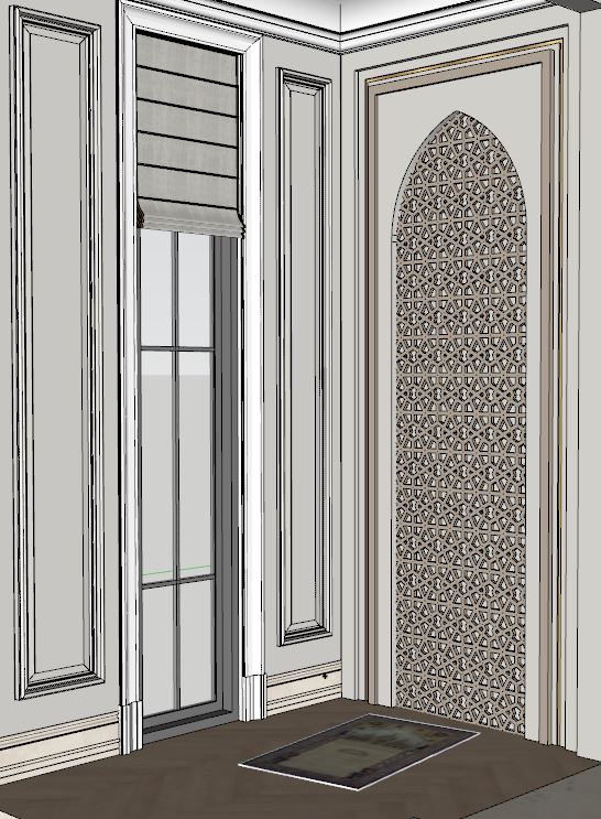 create ultra realistic images without changing any structure shape design or material do not resize the jpeg do not change the color material or shape add indirect light spot light to the ceiling use soft light brown herringbone wood texture for the floor add indirect light to the laser cut panel
