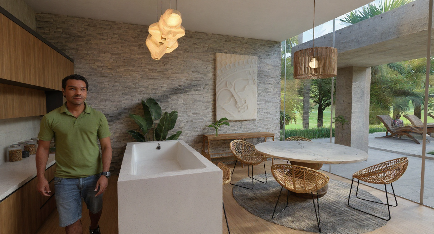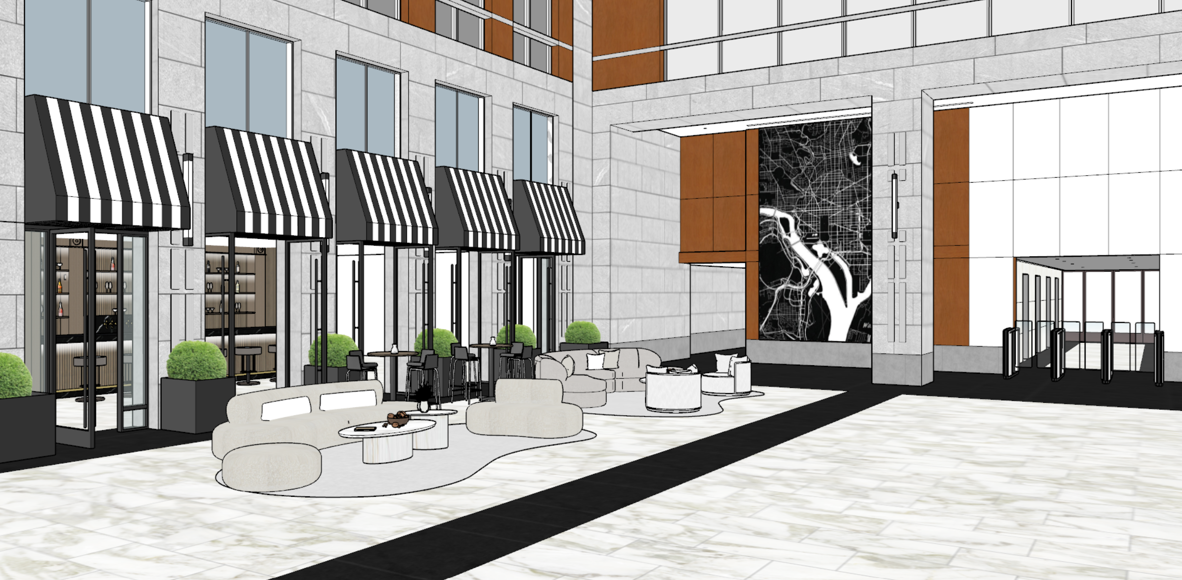 render grand lobby accessing the bistro all spaces have consistent lighting