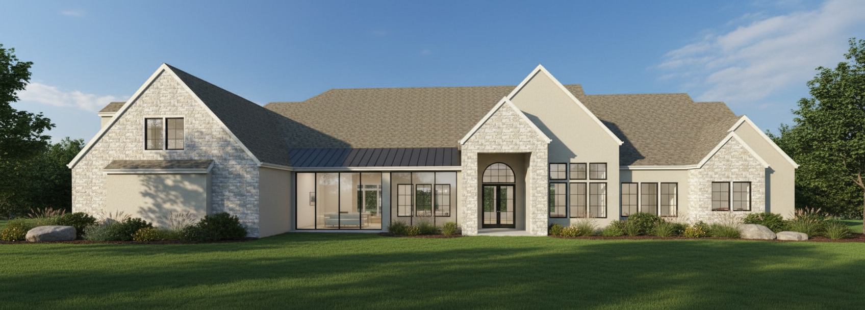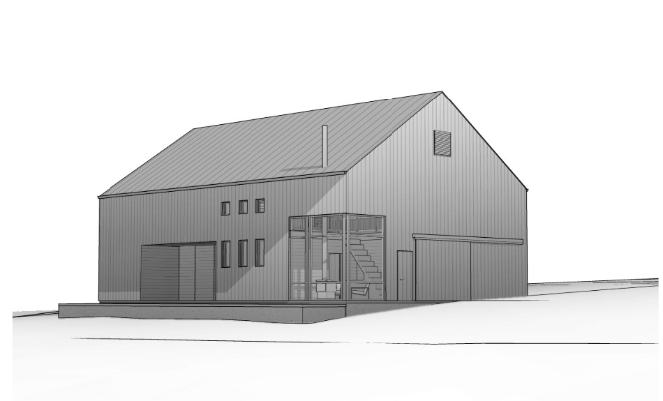 modernist exterior shot galvalume siding and natural wood covered porch area with concrete base architecture