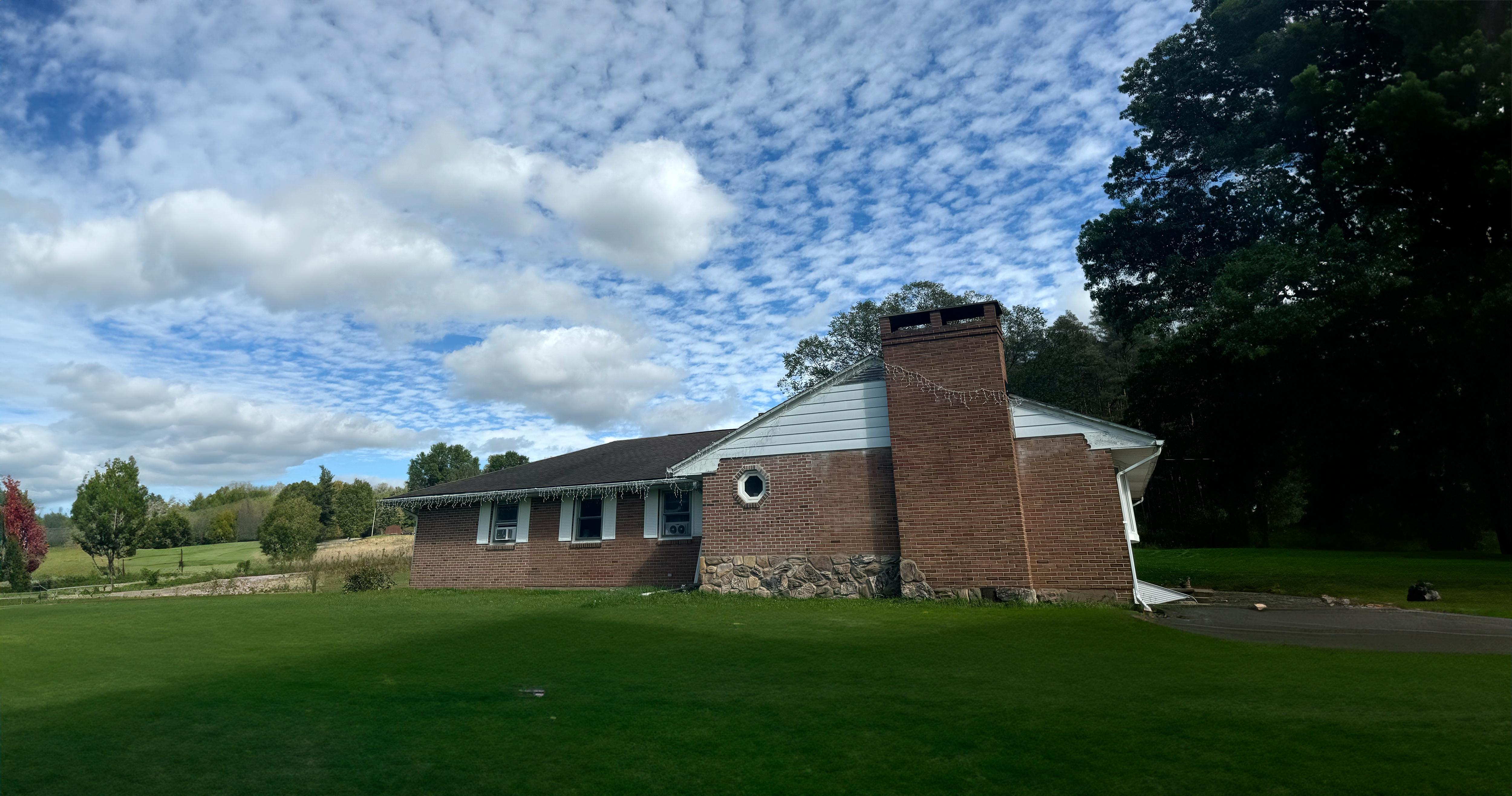 bauhaus night shot a cozy brick house with a chimney nestled in a lush green yard the house s walls are rich off white adorned with white and black accents the roof is a dark earthy shade the sky is filled with fluffy white clouds against a vibrant blue backdrop creating a serene and peaceful atmosphere majestic green trees surround the house with a vibrant red leaved tree adding a splash of color the overall mood is calm and tranquil capturing a perfect day in the countryside architecture