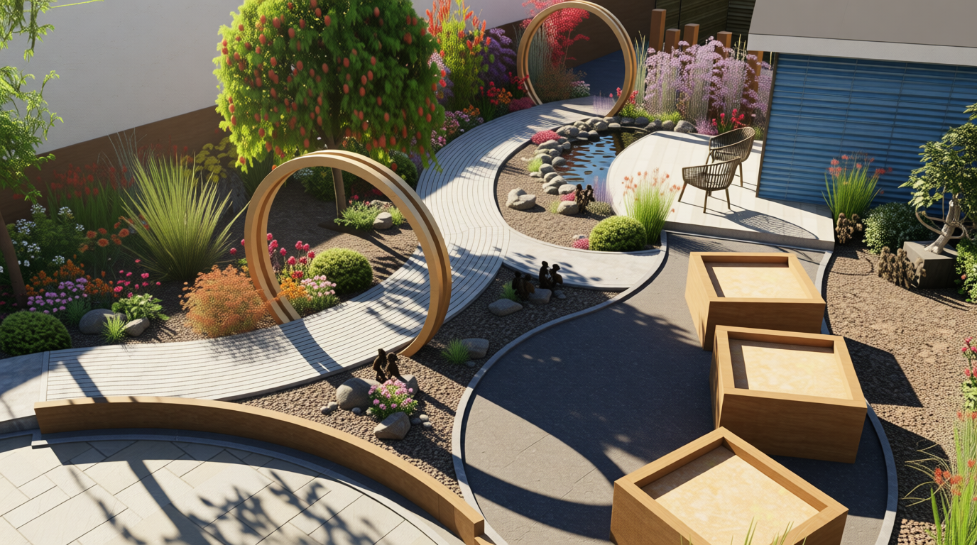 generate an illustrative architectural concept visual from a basic cad massing model of a residential masterplan the image should feel naturalistic warm and atmospheric with a softly cinematic autumn setting emphasise landscape led design ecological features and human activity use painterly realism rather than sharp photorealism gentle depth of field slightly softened edges and balanced contrast show contemporary low rise housing integrated sensitively into the landscape with natural materials such as black timber muted render and soft red brickwork neutral tones and grey slate and red clay roof buildings should feel subordinate to greenery not dominant make the buildings domestic yet classy and aspirtional include rich planting meadow grasses trees with autumn colour and the central swale through the middle of the image reflecting vegetation add people using the space casually walking sitting children playing to communicate liveability without drawing focus away from the place itself lighting should be soft daylight slightly overcast or low sun with a calm optimistic mood suitable for a uk planning or public consultation visual