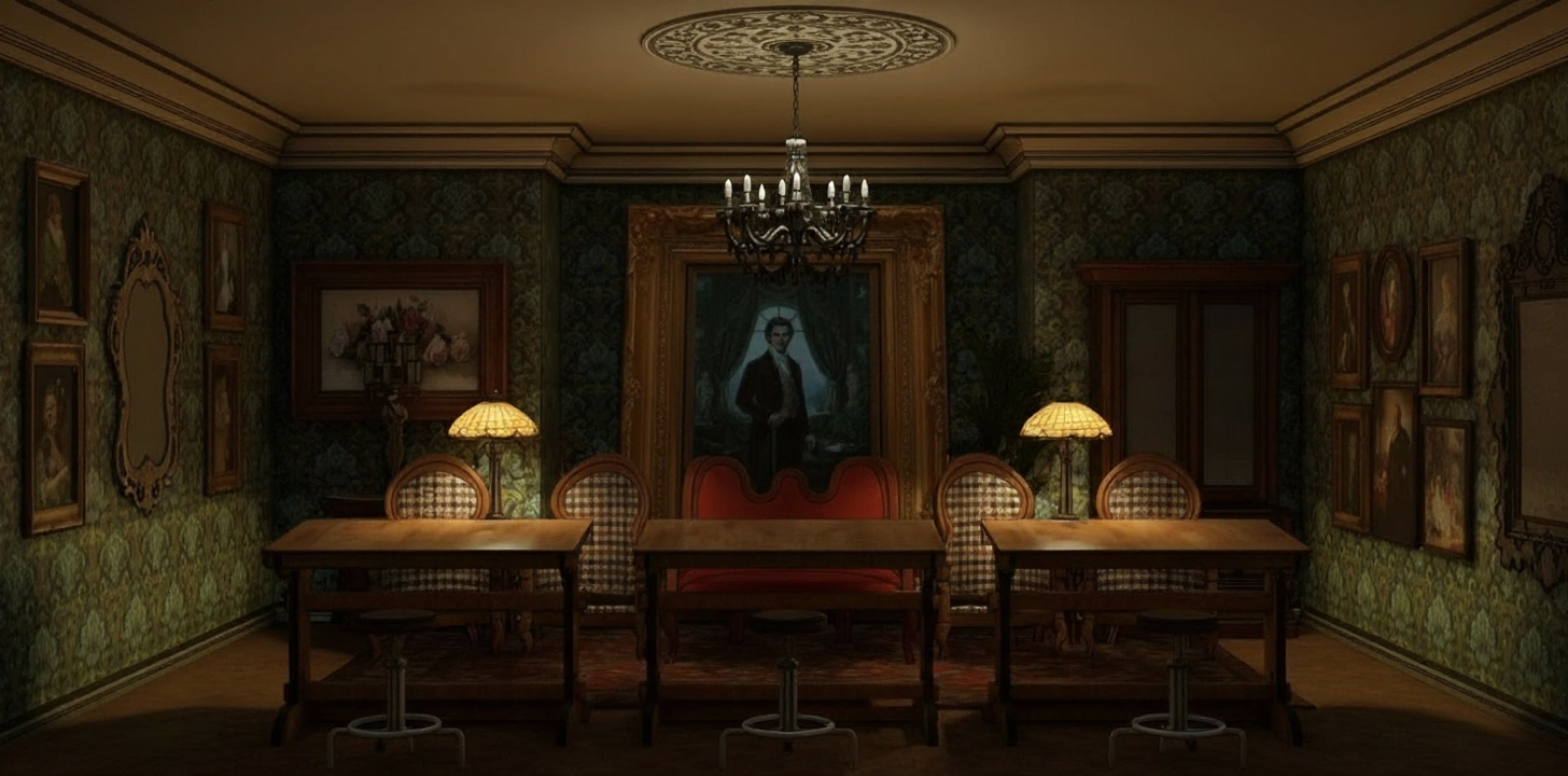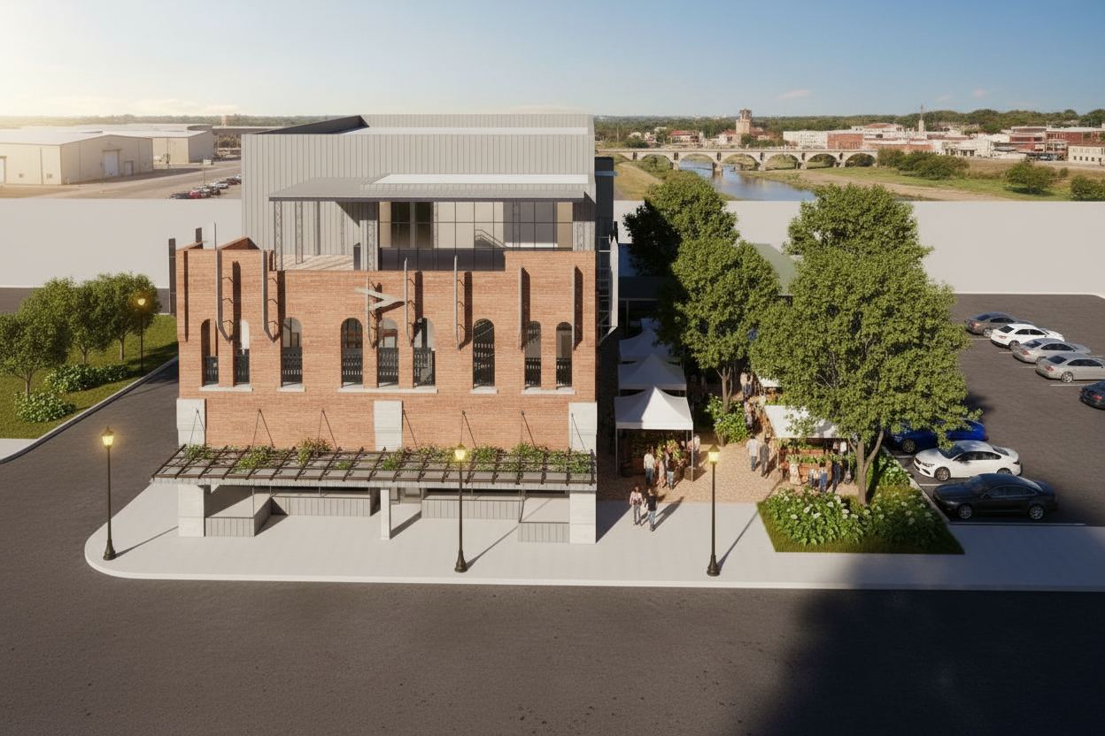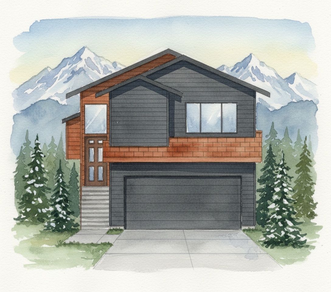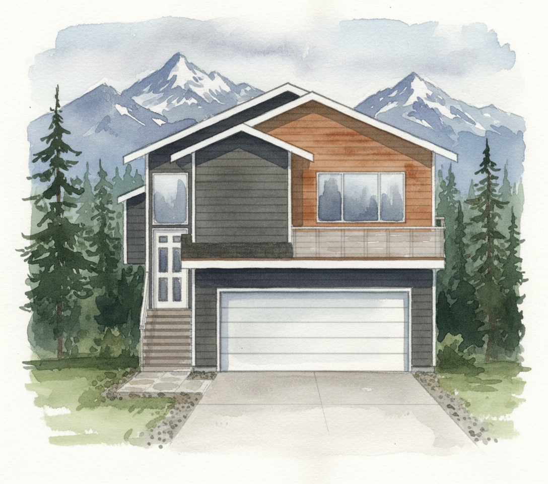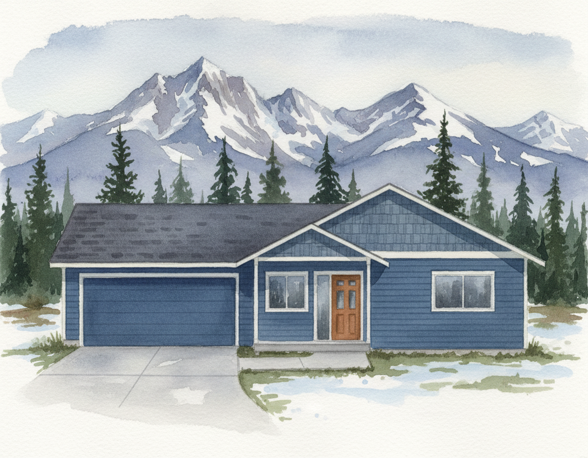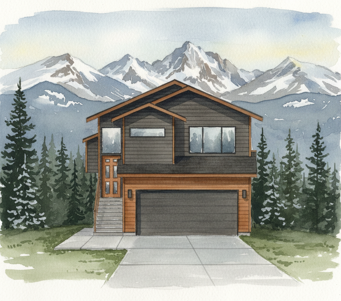 watercolor render of modern home with the house painted green include trees and an alaska like environment in the background simple driveway and walkways in front of the home
