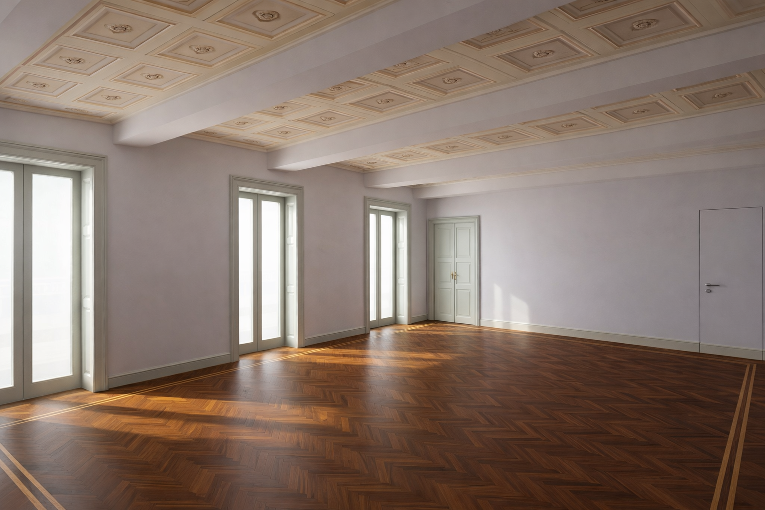a high resolution photorealistic interior photograph of the elegant empty room seen in image 43 png the perspective geometry coffered olive green ceiling all doors window shutters baseboards and walls with their textured fabric wallpaper are perfectly preserved in their original form the unique parquet flooring seen in image 43 png is entirely replaced the new floor is a highly detailed italian herringbone pattern spina di pesce all italiana crafted from aged oak this oak floor features a soft rich natural color and is completely finished with a clear deep penetrating oil treatment which leaves a smooth velvety and decidedly matte opaco surface finish with no glossy or highly reflective areas a continuous precise multi layered border fascia and bindello in a slightly deeper toned oak outlines the herringbone field tracing the perimeter of the room and seamlessly integrating with the olive green baseboards and doorway thresholds the specific sharp rectangular light and shadow patterns from the right window are cast realistically across the new matte herringbone floor and border interacting with the detailed wood texture the entire room is empty immaculate and exactly as in image 43 png with only the floor type and finish changed the small orange detail on the baseboard is still visible the far rooms are empty as before