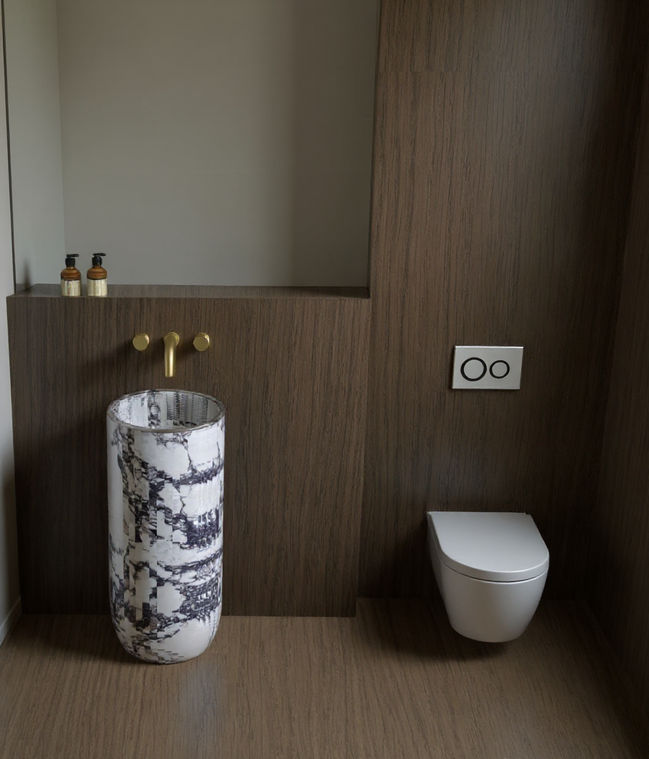 do not change the building do not change the materials make the mood vibe environment the same as the reference images add more texture and sharpness to materials add one person walking