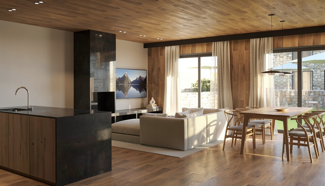 ultra realistic modern outdoor entertaining area featuring a matte black pergola with clean architectural lines and black trim black marble countertop with subtle natural veining and soft polished reflection front of the bar clad in wood look matte fluted porcelain tile with vertical ribbed texture and realistic material depth dark grey woven counter stools with grey patterned fabric cushions detailed fabric texture and stitching subtle wall sconces casting gentle shadows across a horizontal slatted privacy wall creating soft architectural light without led strips timber deck boards with natural grain variation and realistic spacing bright natural daylight soft diffused lighting realistic hdri sky landscaped backyard setting with subtle greenery depth matte black powder coated steel with soft reflections realistic shadow softness global illumination ambient occlusion physically based rendering architectural photography eye level perspective 35mm lens shallow depth of field slightly blurred background balanced exposure true to life colours photorealistic high detail 8k resolution keep original layout and proportions do not redesign structure no led strip lighting no dramatic sunset lighting no neon glow