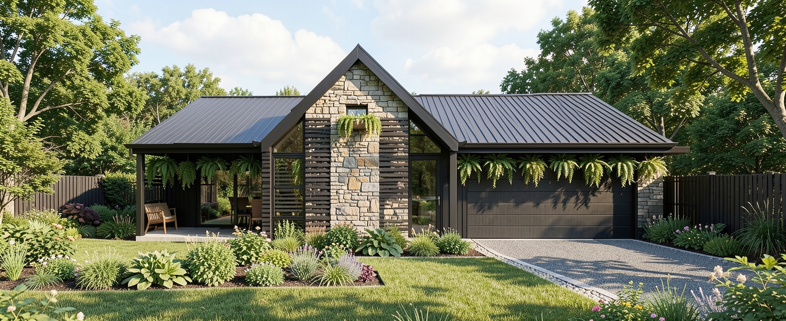 give a transitional style landscape include a short straight driveway leading up to the garage doors the home should back up to a wooded area