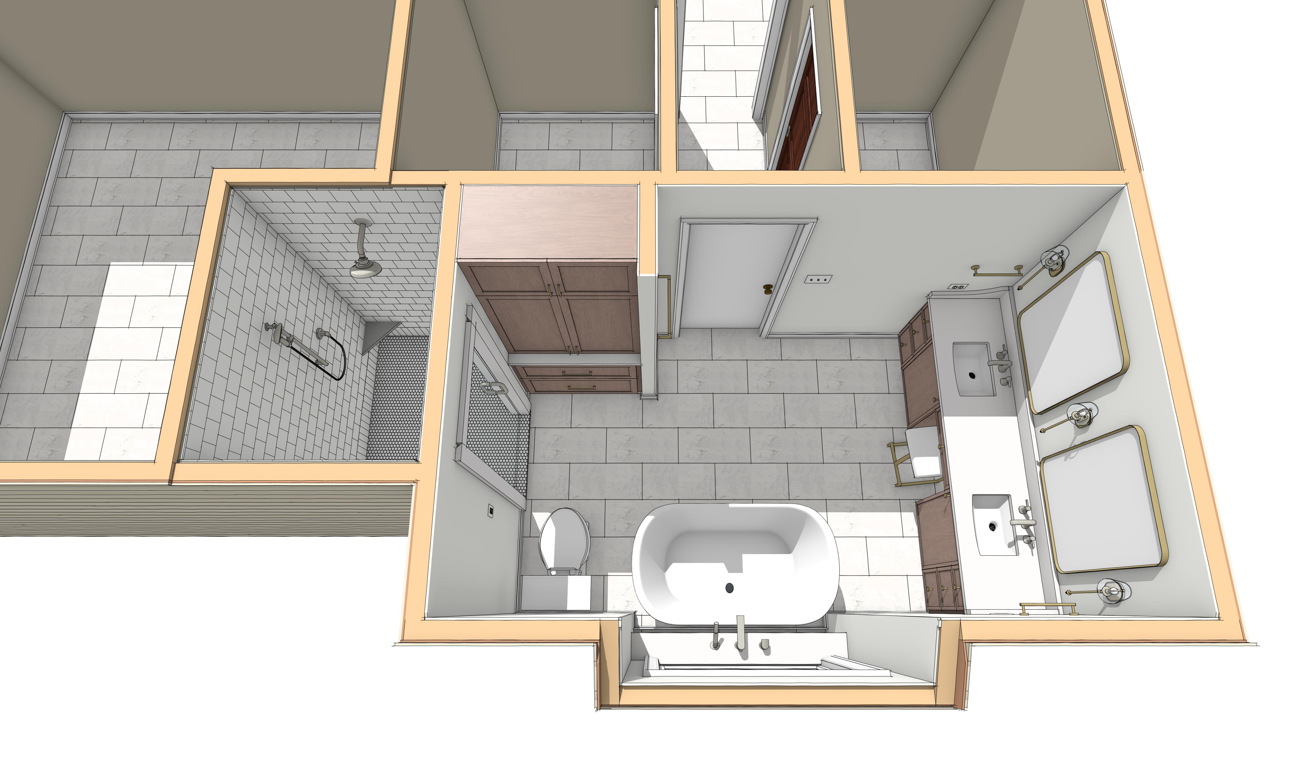 add water to bathtub add bath accessories add towels to towel bars only show bathroom and adjacent shower not rooms along top of image show daylight from window in front of bathtub