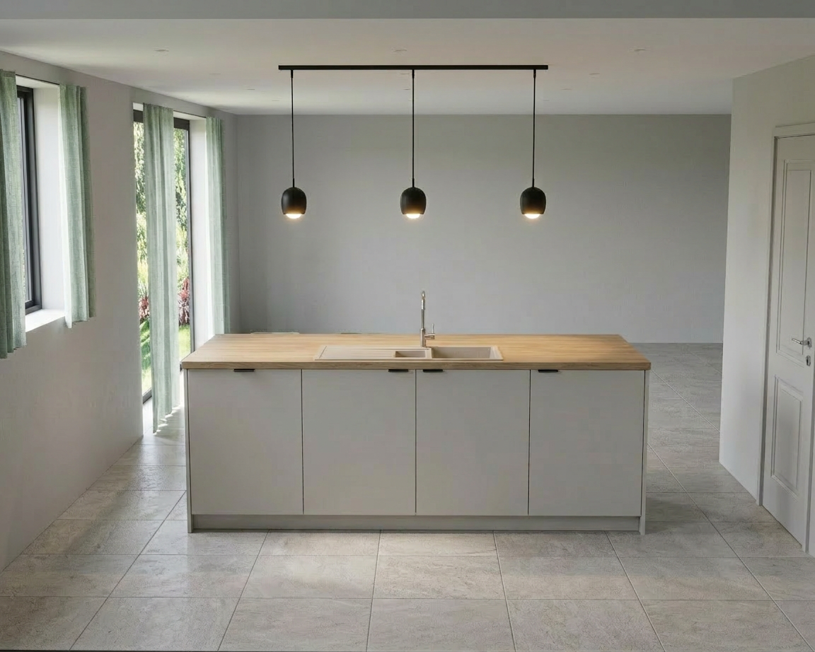 use the provided render strictly as the base image do not change the camera angle composition lighting furniture materials or any other objects in the scene modify only the rabbit located under the cabinet change its fur color to match the rabbit in the reference photo predominantly black fur with a distinct white neck chest area keep the rabbit s shape pose and position exactly the same additionally slightly reduce the amount of hay inside the cage so that the cage looks cleaner and less filled while still keeping some hay visible do not modify anything else in the image