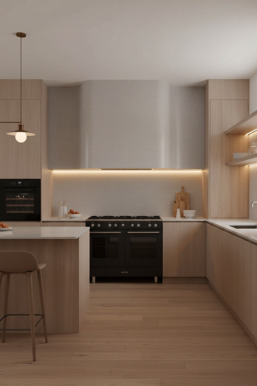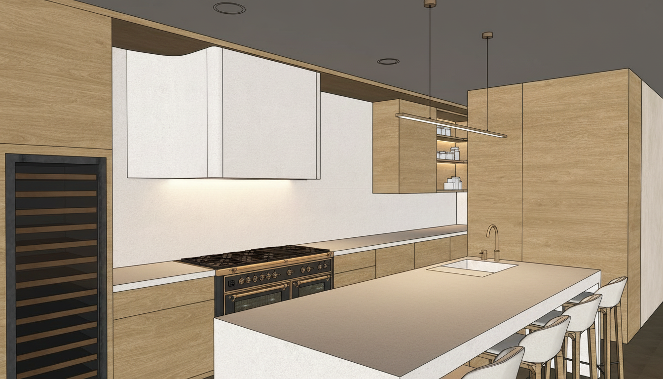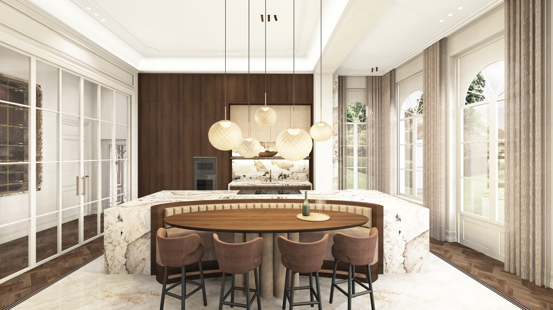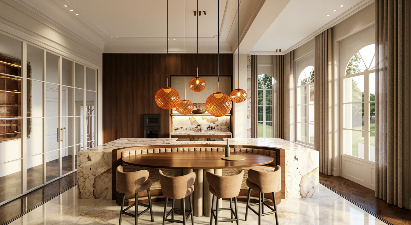 transform this image into an ultra realistic 3d photorealistic render preserve the exact original perspective camera angle proportions composition and geometry without any distortion or structural changes refine all materials to a high end interior standard using physically accurate pbr textures materials may be enhanced in quality and realism but must remain consistent with their original type color and placement do not replace or reinterpret materials create a warm hotel chic atmosphere with a refined and elegant feel use a harmonious palette of warm neutrals beige champagne soft browns while maintaining a natural and balanced look avoid overly warm orange or yellow color casts the overall lighting should remain neutral warm and sophisticated not tinted or saturated apply soft diffused lighting with low contrast avoid harsh shadows deep blacks and strong highlights use gentle transitions and a smooth tonal range for a calm and luxurious mood natural stone surfaces may have a subtle refined reflection with a soft gloss finish not shiny or mirror like but elegant and realistic the pendant lights are tom dixon whirl pendant light made of glass preserve their exact design color and material appearance do not change their shape tone or transparency use a professional full frame camera look with realistic depth of field accurate exposure and balanced tonal values maintain clean flawless surfaces no dust no scratches no damage ensure a high resolution sharp output 8k quality with lifelike colors and a premium interior design feel do not redesign the space only enhance realism material quality and atmosphere within the existing scene