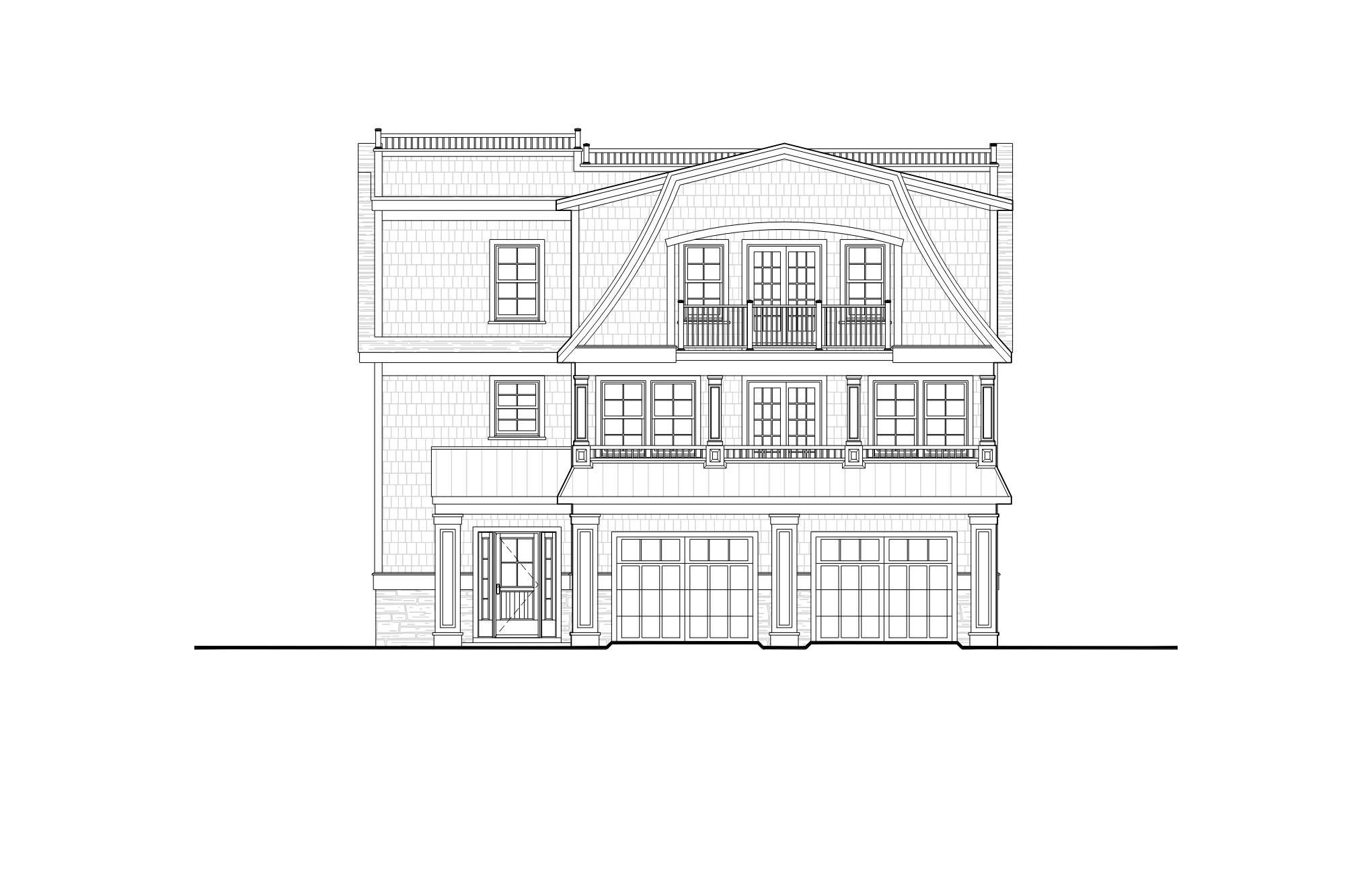 render this 2d cad front elevation the exterior is a shake siding beige in color with a stone veneer along the bottom the trim is white in color to help it pop out the standing seam metal roofs on the porches will be black in color the shingle roof will be dark gray the atmosphere will be during the golden hour the front of the house faces the bay while the back of the house is on a lagoon