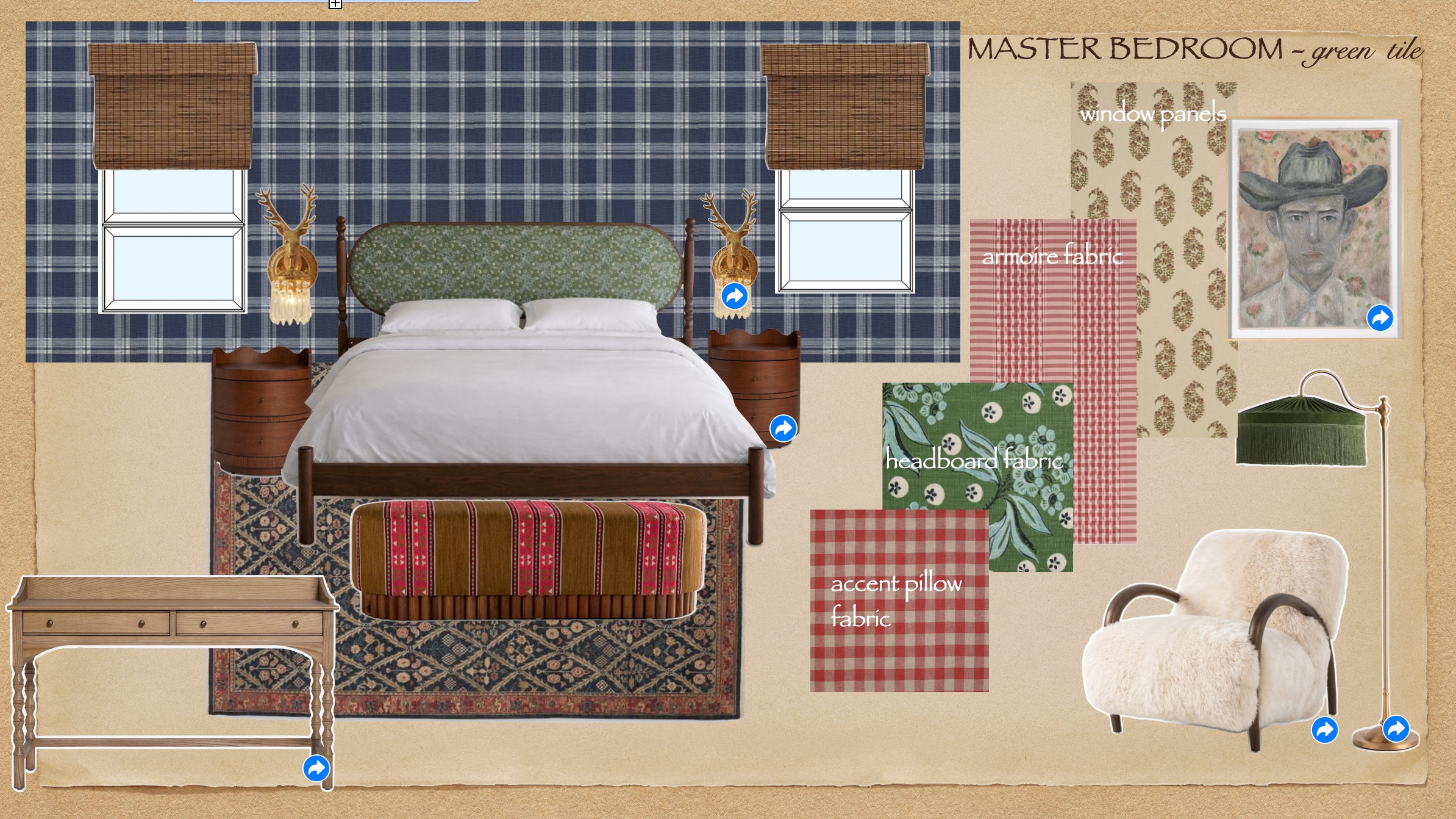 take this design board and make it a 3d room image there are two windows next to bed and 1 window on right wall the windows on that wall get window panels but the ones next to bed get romans same fabric use the furniture and fabrics shown the blue plaid fabric is on all walls the window panels on side window is the paisley print floors are a rustic dark oak and the rug is shown do not show the swatches show the desk against the wall with tv above and the chair and lamp in the corner