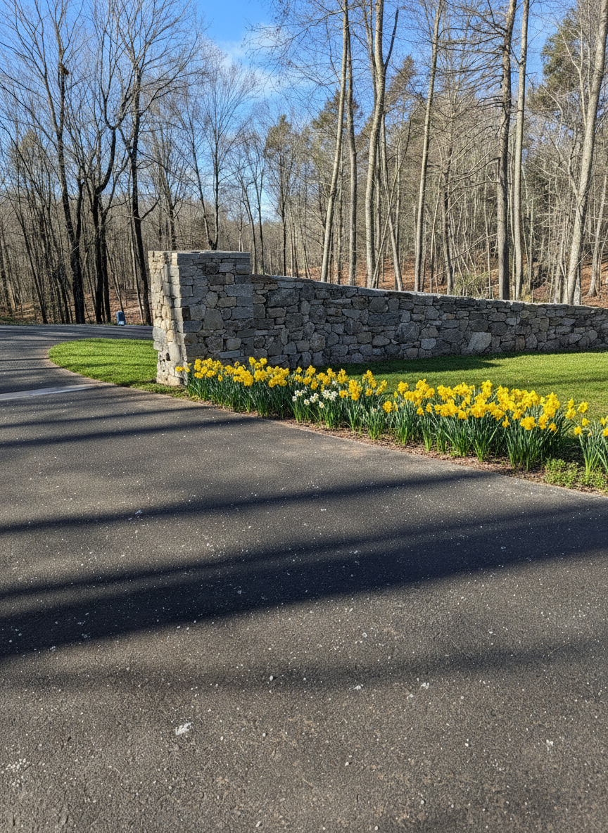add small bed with daffodils up against front of wall add wooden gate across driveway from wall pillar