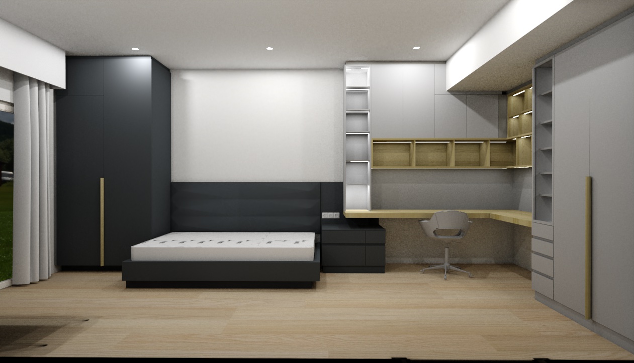 a modern minimalist bedroom with a luxurious and serene ambiance black wardrobe with subtle gold handles on the left seamlessly integrated white and gray storage warm wooden shelves and desk in light oak elegant gray office chair white walls with soft warm lighting natural light streaming through large windows with sheer white curtains light wooden floor atmosphere is calm and inviting