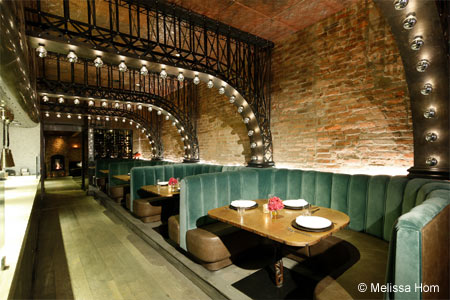 clean up the quality and clarity of this image revise the banquettes to a black leather upholstery