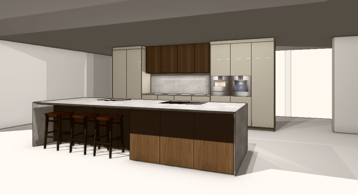 render a luxurious kitchen interior with a warm cozy and elegant atmosphere use soft indirect lighting to create a sophisticated and intimate mood enhancing the richness of the materials and highlighting fine details the floor is made of light colored stone tiles each 120 cm x 120 cm with a smooth matte finish that gently reflects light the countertop is crafted from classic emperador dark marble featuring deep brown and orange tones with rounded flowing veining patterns characteristic of genuine emperador dark the surface should appear polished vibrant and luxurious all wood elements including base cabinets shelves and hanging elements are made from very dark brown wood with a calm uniform grain for a refined and timeless appearance in the back composition both the standing base cabinets and any non hanging units should be finished in a warm uniform brown tone smooth and elegant without visible grain to create visual harmony and depth only the hanging cabinets above the central gap should be made of smoked oak matching the island to establish a strong material connection within the space the island features a sink on the left side and a cooking station on the right with a sleek integrated tap in brushed bronze or gunmetal for a sophisticated look decorate tastefully with wine glasses carafes and minimal elegant accessories to add realism and subtle refinement use realistic materials soft reflections and warm ambient lighting to emphasize craftsmanship texture and atmosphere the final render should focus on the back composition highlighting the interplay between uniform warm brown cabinetry smoked oak elements and the emperador dark marble the overall mood should feel dark elegant and inviting filled with warmth depth and understated luxury ad a long light above the island all the cabinets of the island have to be in the same wood as the hanging cabinets from the backcomposition ignore the two vertical lines in the very front and make the colors dark elegant and the light warm and cozy architecture