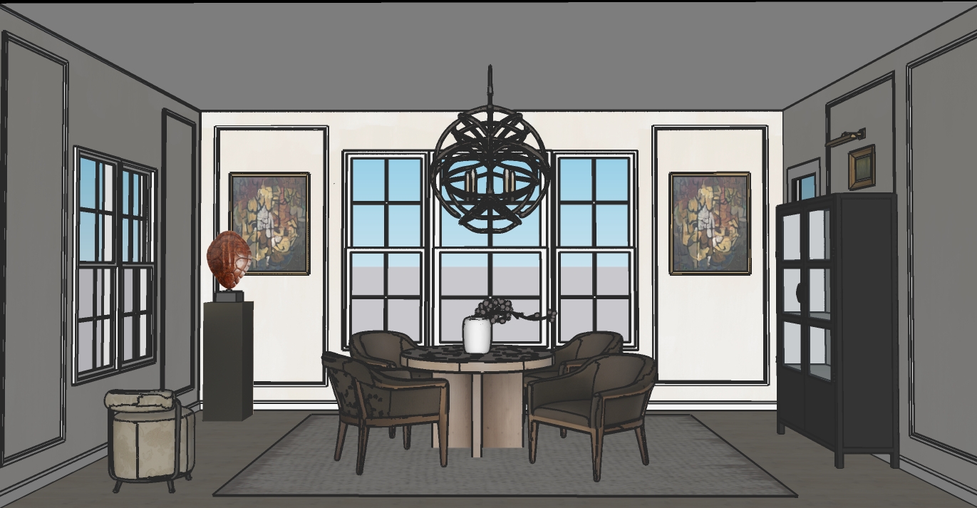 the floors are an oak color the table is light oak wood the chairs are a brown olive fabric with wood legs the walls have an greige limewash paint on them the outside environment is trees and a yard