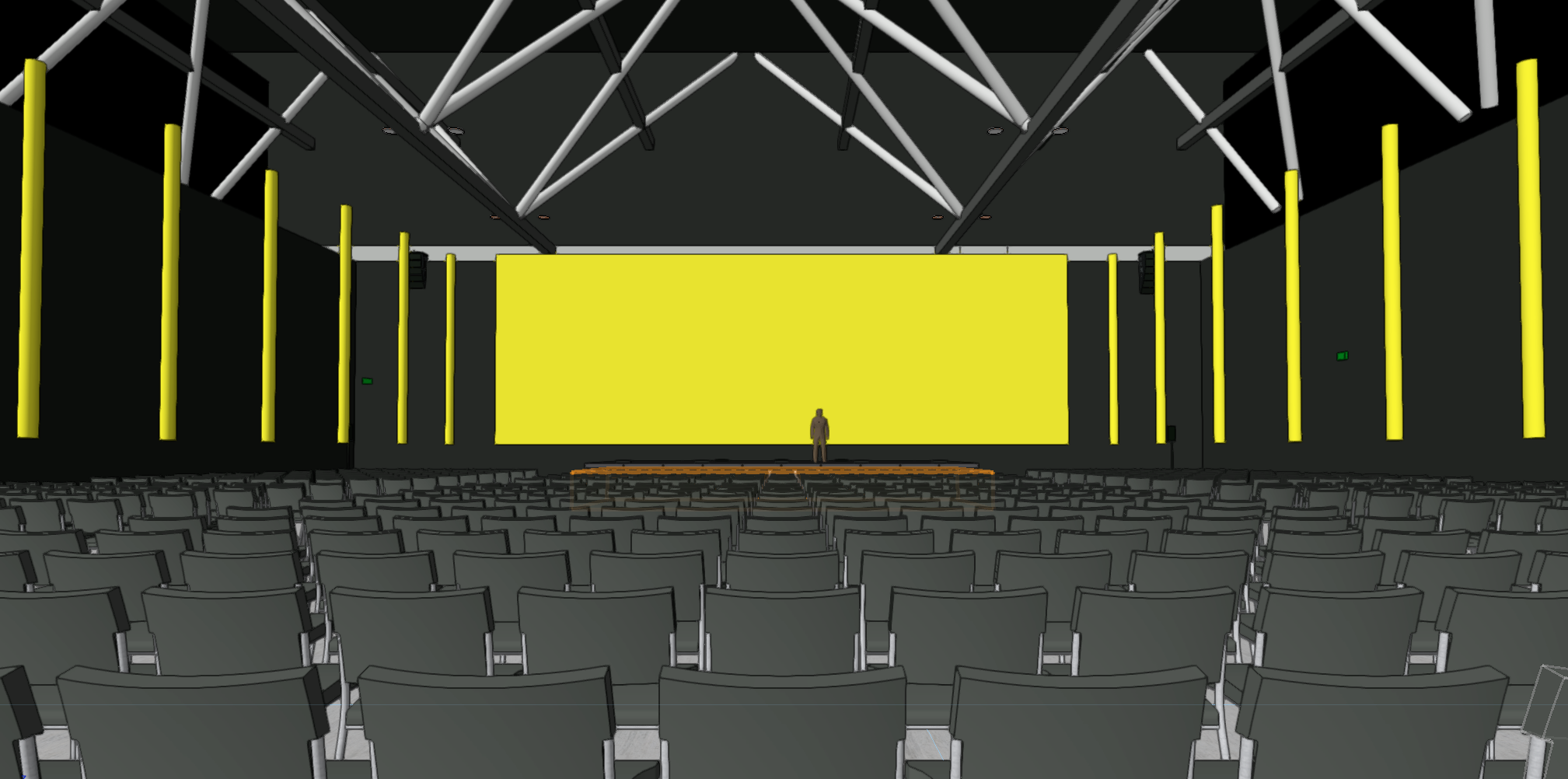 a man stands on stage in the distance within a dark immersive stage environment with an oversized led screen and light tubes behind him illuminated glowing yellow