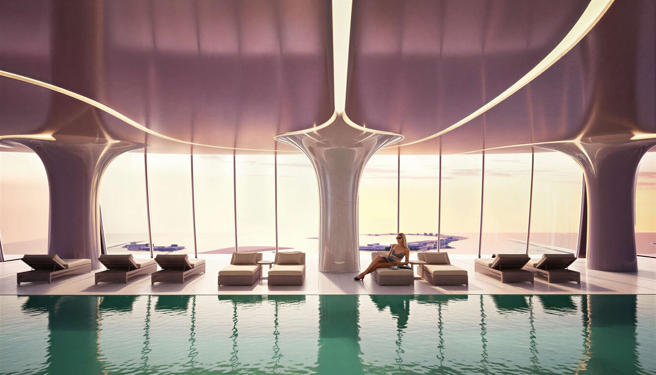 futuristic sky pool in a luxurious interior setting late afternoon glow