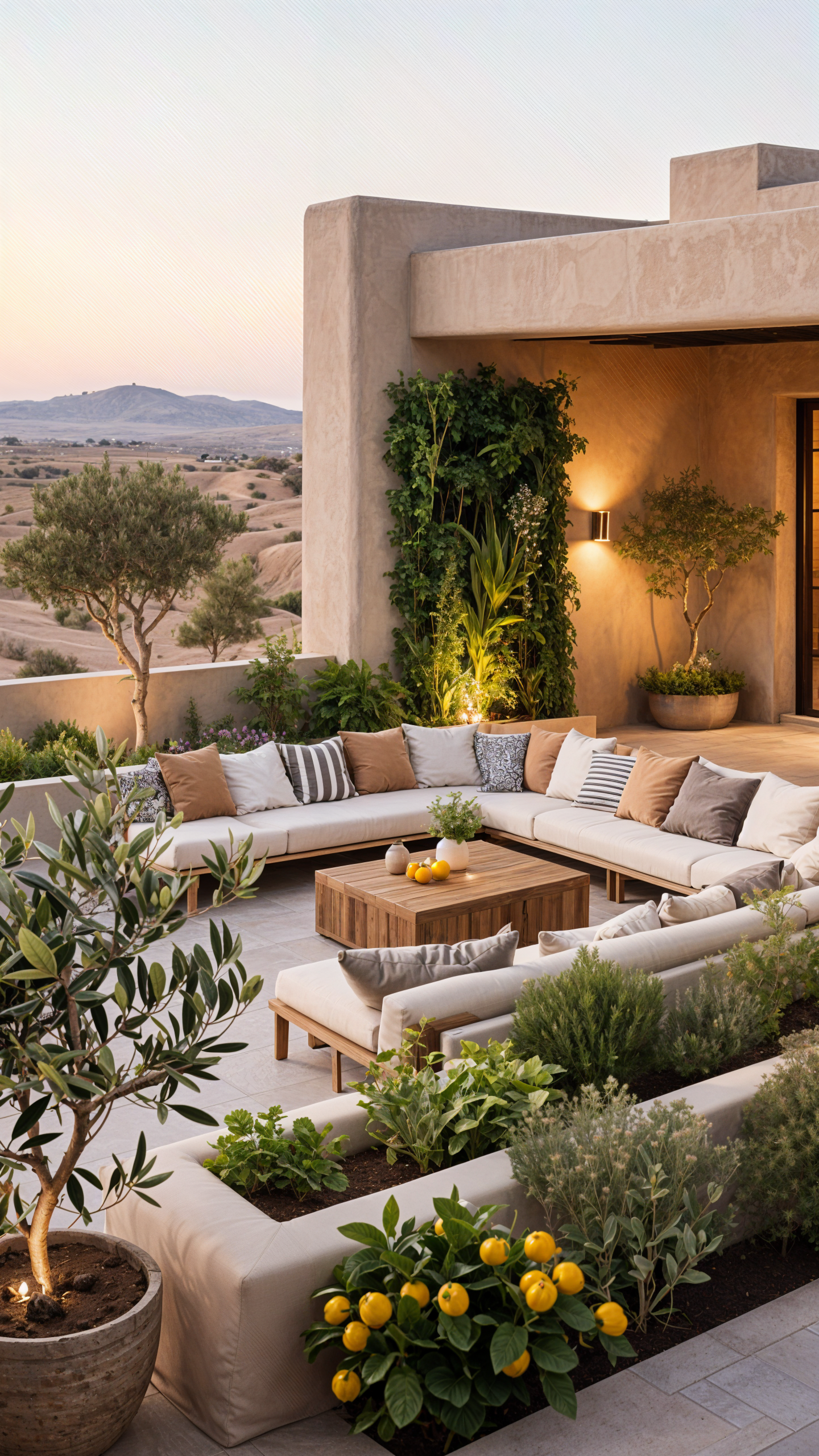villa terrace lounge outdoor seating with cushions edible landscaping around with olive and citrus trees vertical herb wall warm lighting desert modern luxury architecture