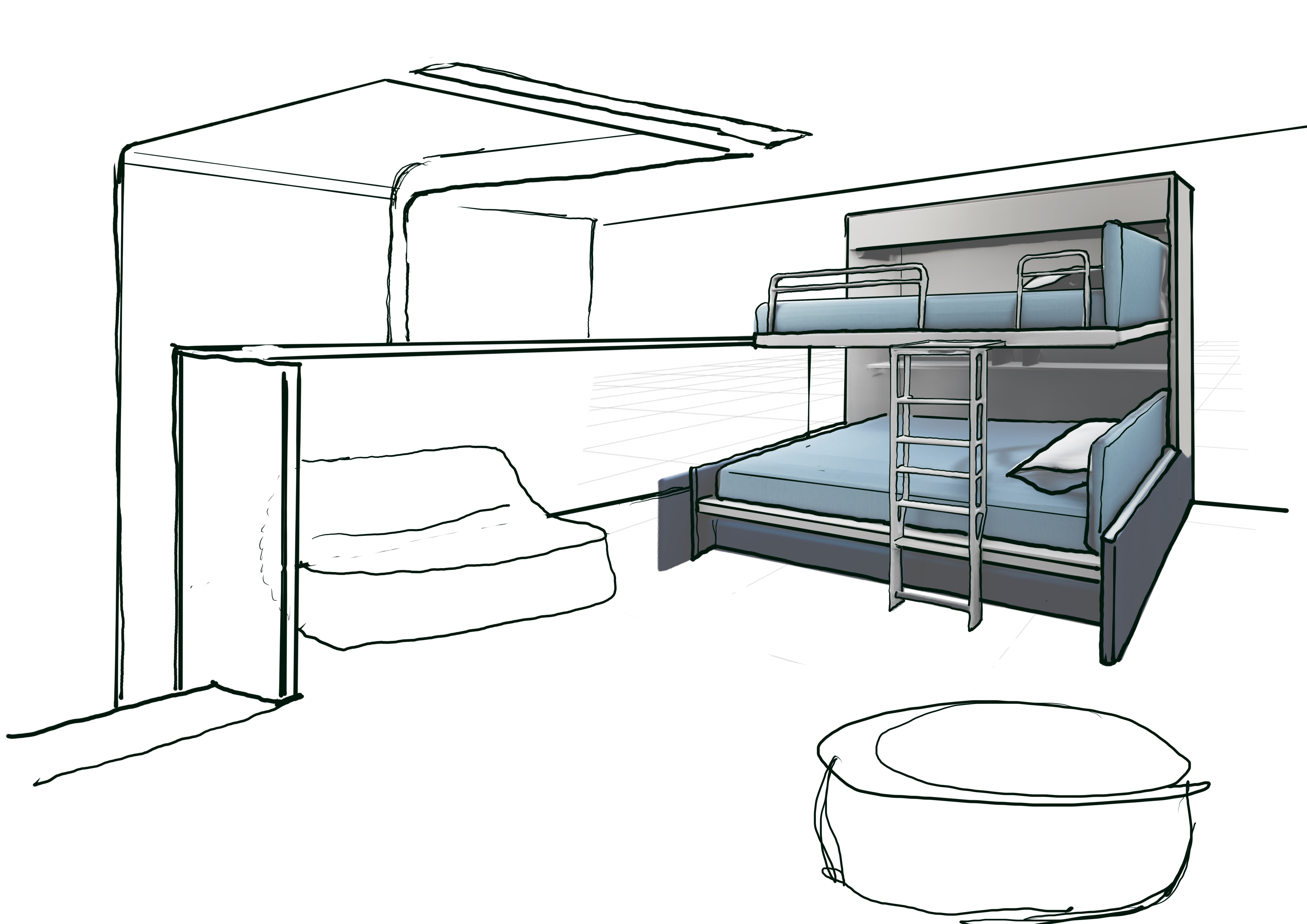a mezzanine floor of a forest cabine with wood interiors castle beds white soft chair and pouf adjust perspective of the beds render the glass window that turns on the roof soft natural lighting