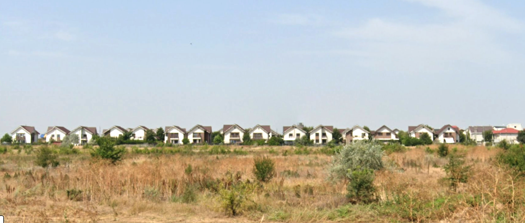 modernist exterior shot a picturesque landscape of a serene suburban neighborhood with a row of charming modern houses featuring white and light gray walls and dark gray roofs under a clear bright blue sky the houses are nestled amidst lush greenery with various shades of green bushes and small trees the foreground is an expansive golden brown field with patches of dry grass and shrubs the atmosphere is tranquil and inviting filled with warm sunlight architecture