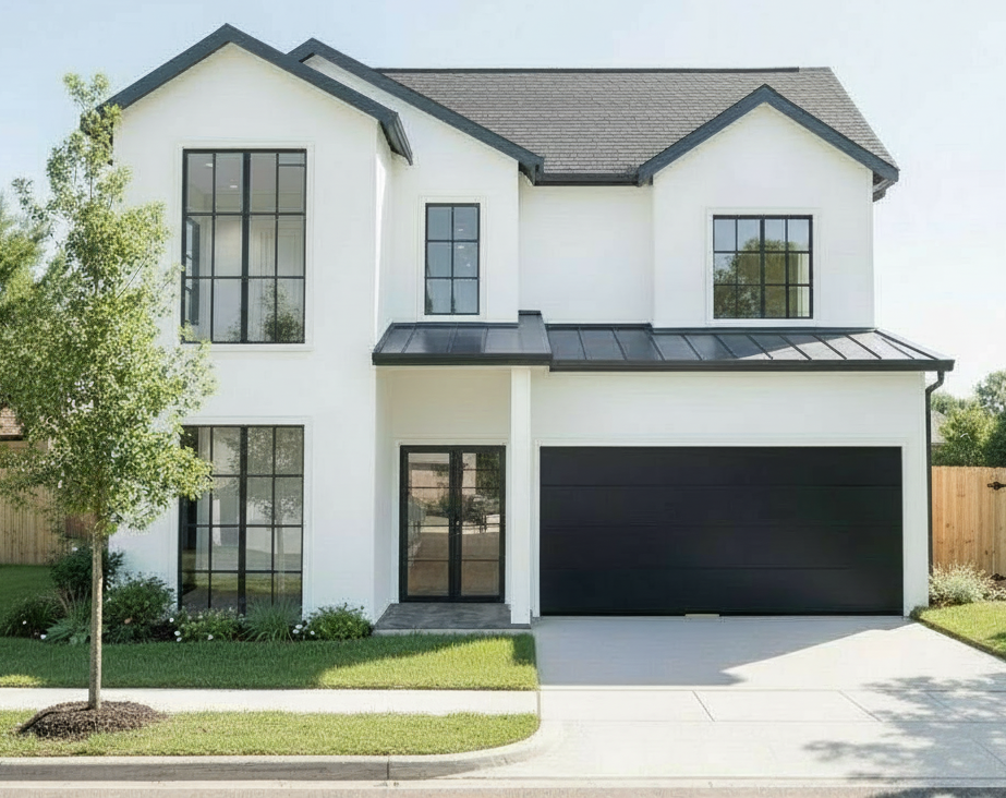 render the image as a highly photorealistic architectural digest style exterior photograph lighting should feel natural and soft with realistic daylight subtle shadows and accurate exterior light falloff materials should display true to life texture and depth including smooth stucco finish dimensional roof materials natural wood grain in fencing the landscaping should appear lush estate style and intentional with clean edges and refined planting the overall image should feel warm elevated and convincingly photographic suitable for high end real estate marketing