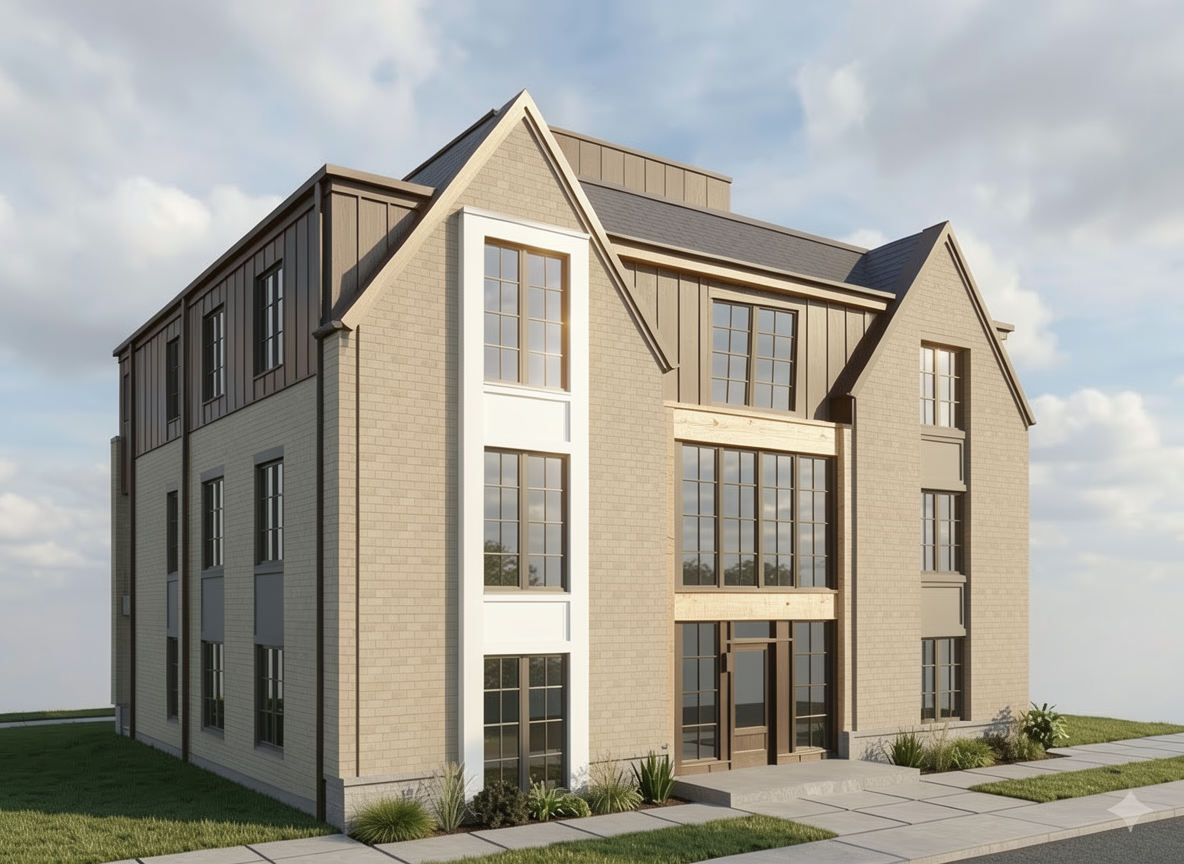 use the reference image as base composition modern laboratory and office building three story contemporary architecture with minimalist design and clean geometry facade materials smooth polished concrete facade in light gray tone large architectural frame made of polished concrete painted matte black wrapping the second floor terrace exposed red brick walls inside the recessed volume large black aluminum framed windows with floor to ceiling glazing and continuous horizontal window bands the building has large modern windows for laboratory and office spaces creating a clean and professional contemporary research facility aesthetic at the entrance there is a small concrete staircase leading to a polished concrete platform with a geometric concrete planter containing an orange tree making the tree an important landscape element that softens the architecture landscape minimal lawn clean modern planter integrated into the architecture orange tree with visible fruits as focal point near the entrance lighting and atmosphere golden hour sunset lighting warm natural sunlight hitting the concrete and brick textures soft long shadows subtle warm interior lighting visible through the windows but not excessive led exterior lighting calm professional atmosphere rendering style photorealistic architectural visualization high quality materials v ray style realism soft global illumination balanced exposure architectural style modern mexican contemporary architecture minimalist laboratory and office building refined material contrast between polished concrete black frame glass and brick camera three quarter frontal perspective showing the entrance tree planter large windows and architectural frame ultra realistic textures subtle imperfections in concrete natural reflections on glass cinematic architectural photography