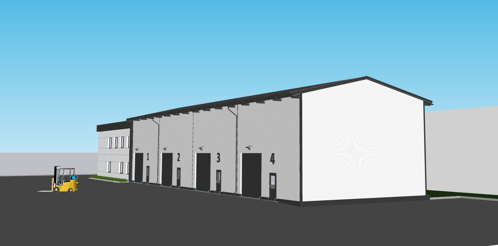 a modern industrial building the administrative part covered with white and anthracite fibre cement boards and the warehouse part with sandwich panels low vegetation around the building anthracite joinery anthracite industrial gates lamps above them a sunny sky with few clouds and an industrial building in the background a forest and industrial buildings in the background