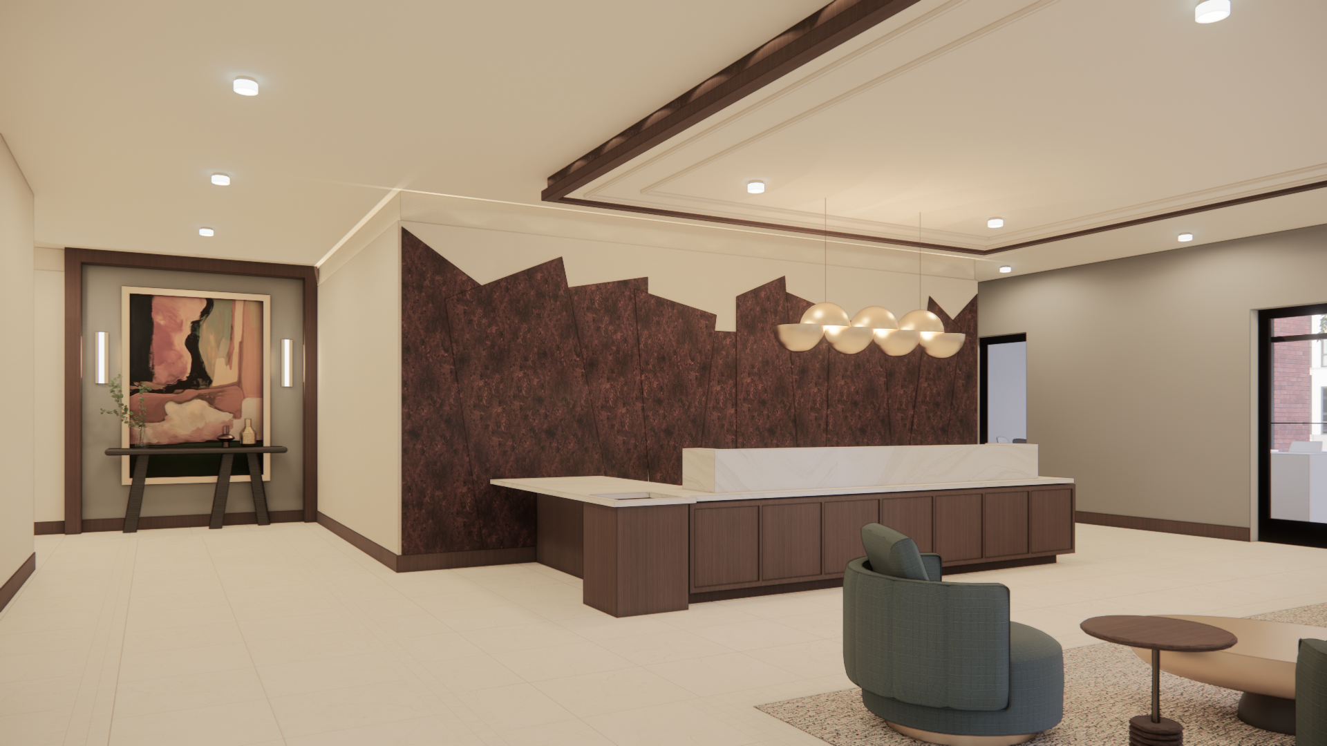 add in plant or flowers at corner of receptionist and stage with accessories like this is a lobby space