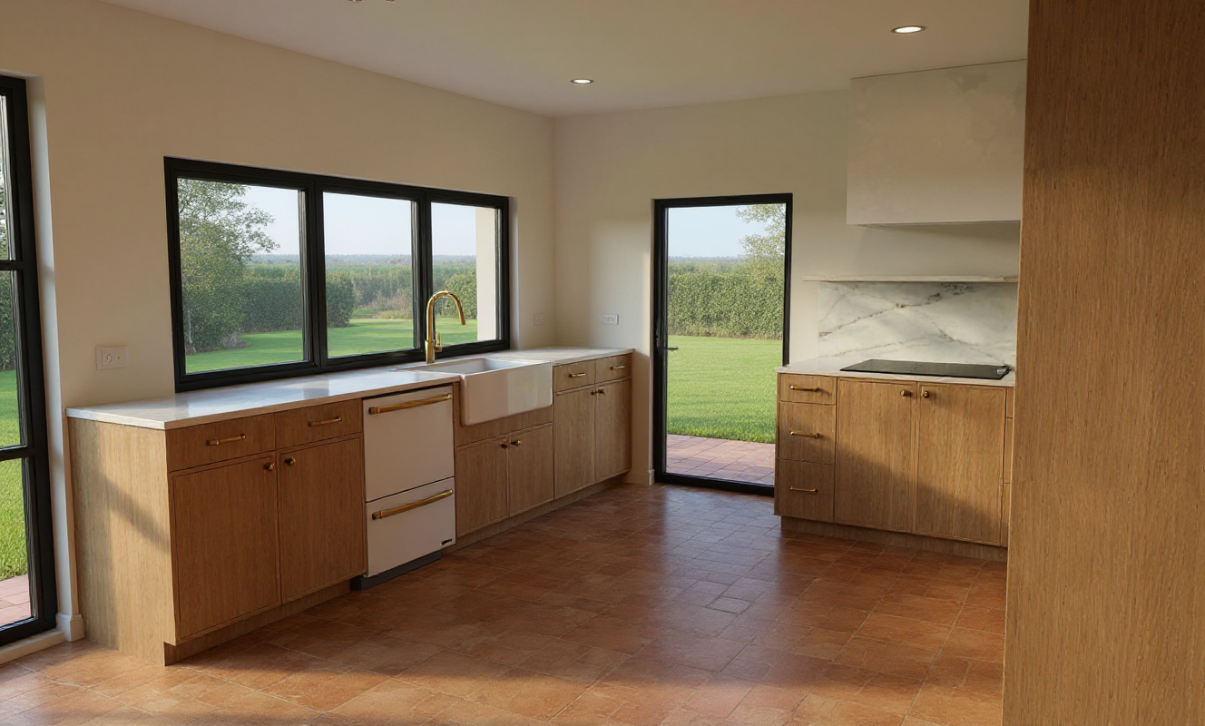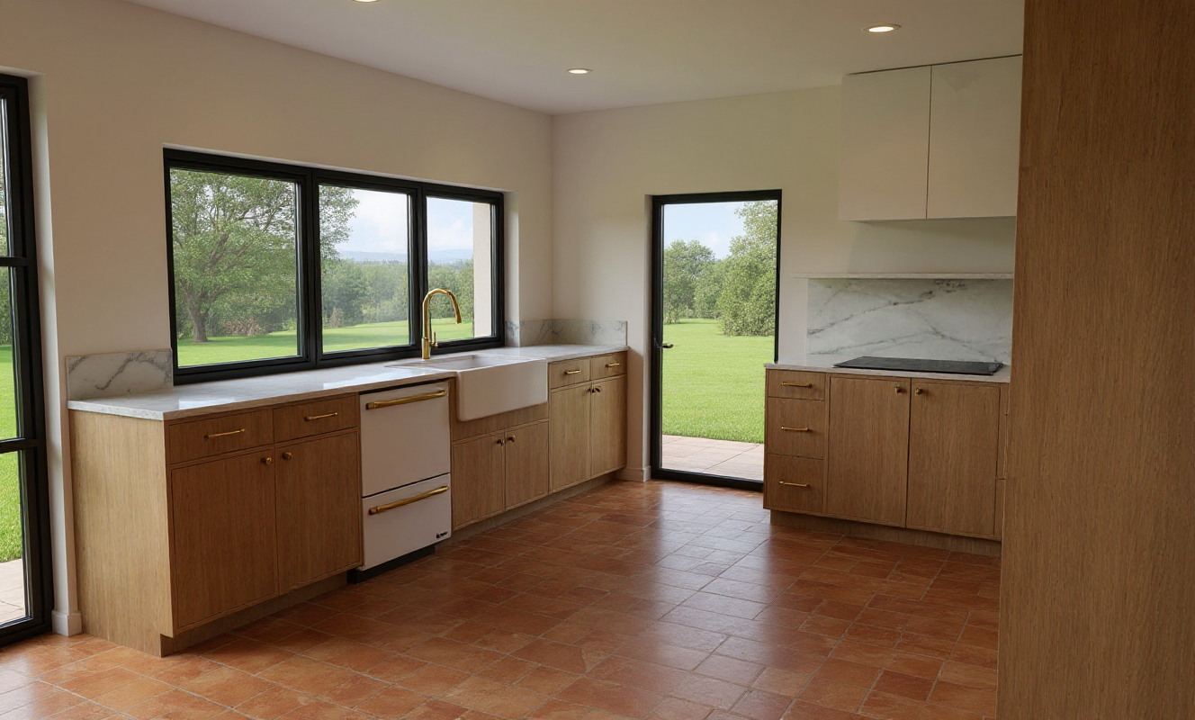 a modern minimalist kitchen interior with a warm and inviting atmosphere the cabinets are in natural oak wood with visible grain complemented by sleek brass handles the marble countertops are pristine white with subtle gray veins adding elegance the walls are painted in a soft muted beige enhancing the cozy feel the floor features a rustic terracotta tile pattern in shades of warm brown overhead lighting is warm casting a gentle glow throughout the space