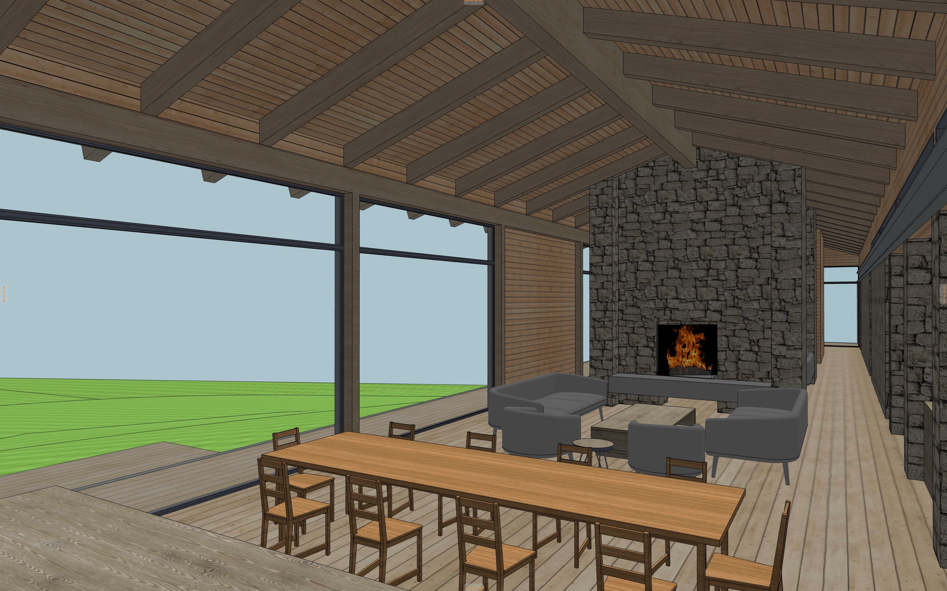 warm and inviting interior space a few decorative light fixtures minimal furniture grassy idaho landscape rolling hills outside
