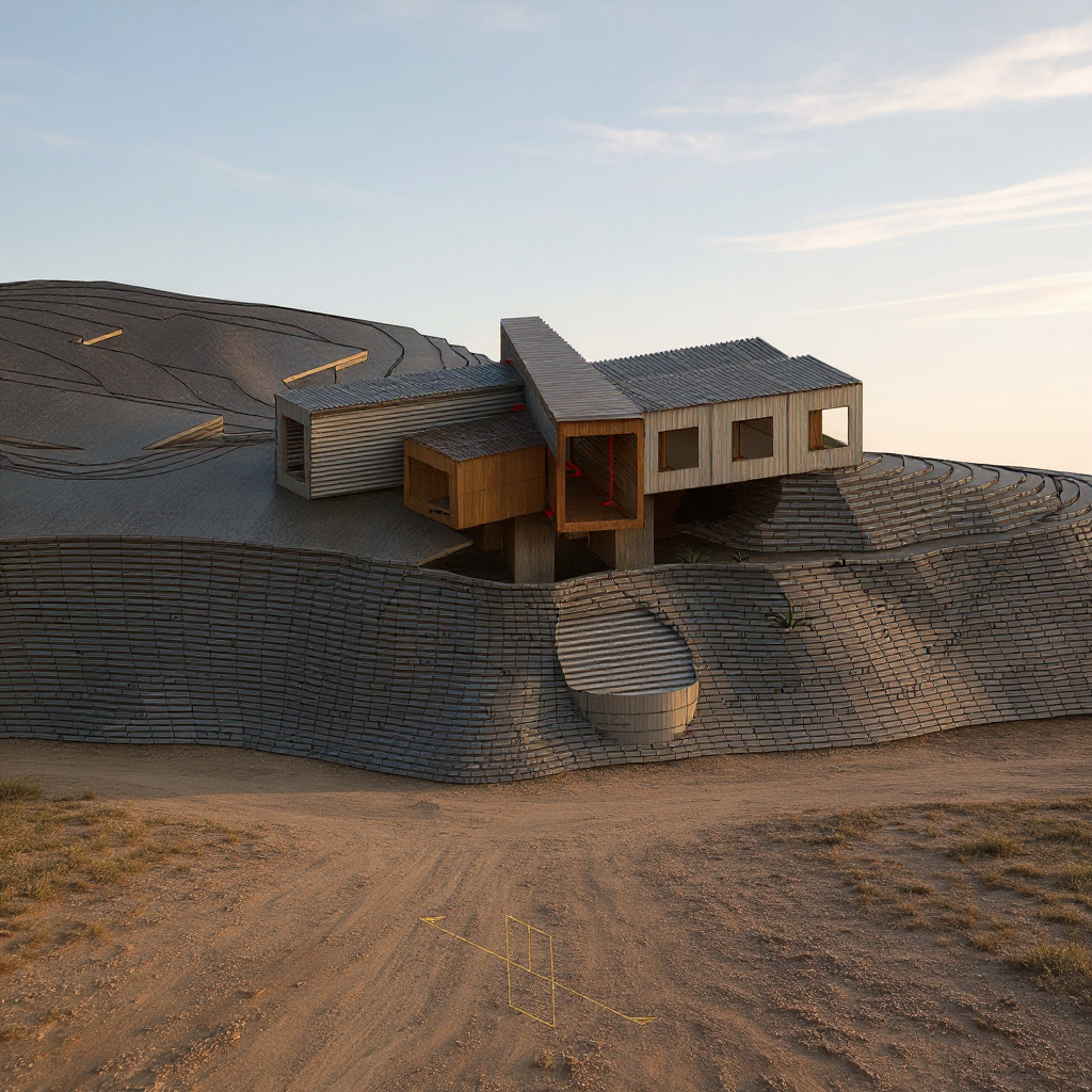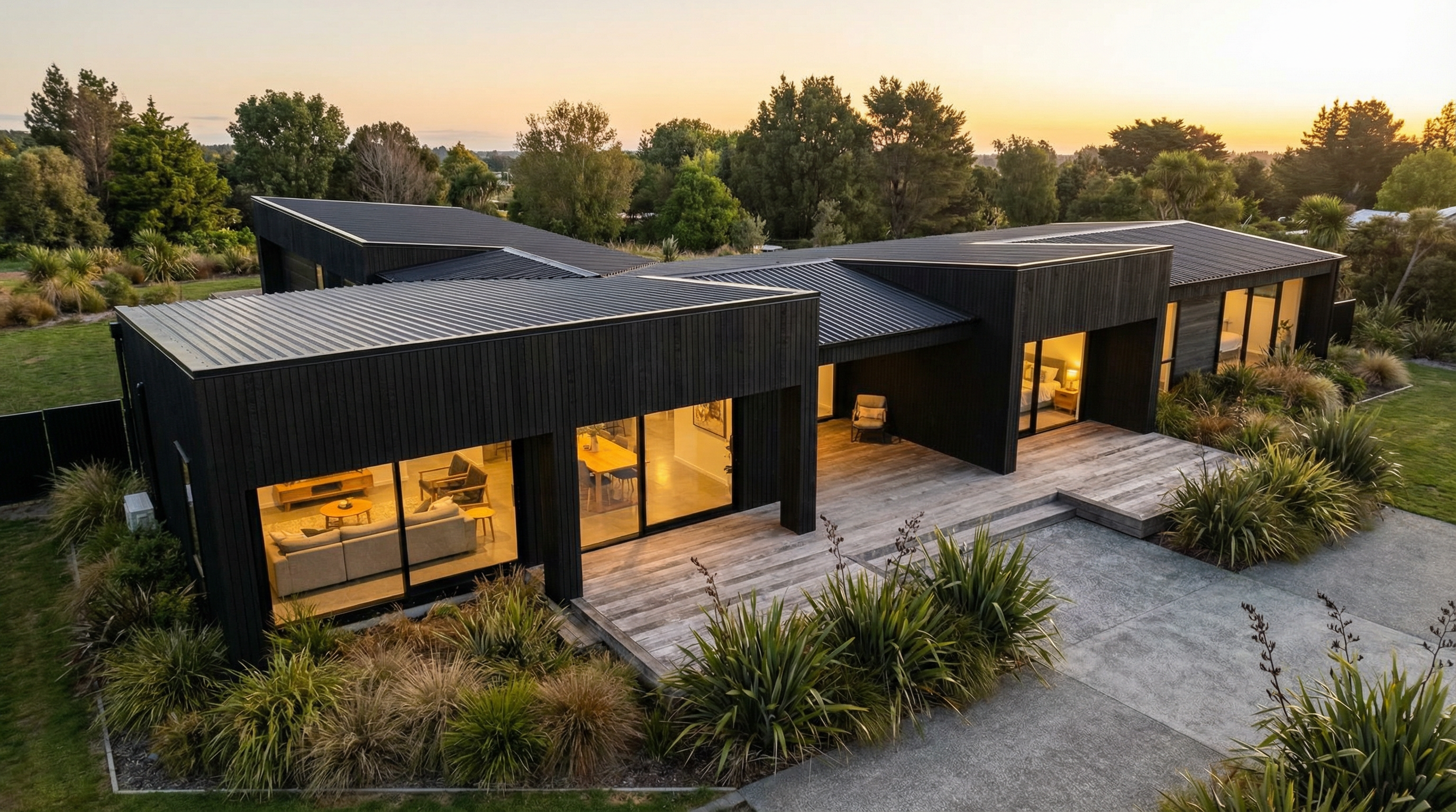 camera pan right black roof black painted cladding black window frames living room interior furniture interior lights on low timber deck concrete paving trees in background extensive native planting sunset