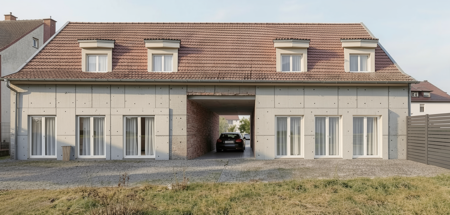 edit the existing render without changing architecture geometry or composition apply concrete only to stucco area replace the stucco material on the ground floor facade with exposed concrete this change must be applied only to the current stucco surface do not apply concrete to brick the brick facade must remain exactly as it is do not modify recolor or cover the brick in any way the brick is a separate material and must stay untouched concrete specification exposed concrete with visible formwork marks medium to large panel scale not small subtle joints and minimal tie holes light gray tone with natural variation windows keep windows exactly the same no moldings important only change the stucco material do not modify any other element photorealistic clean material transition
