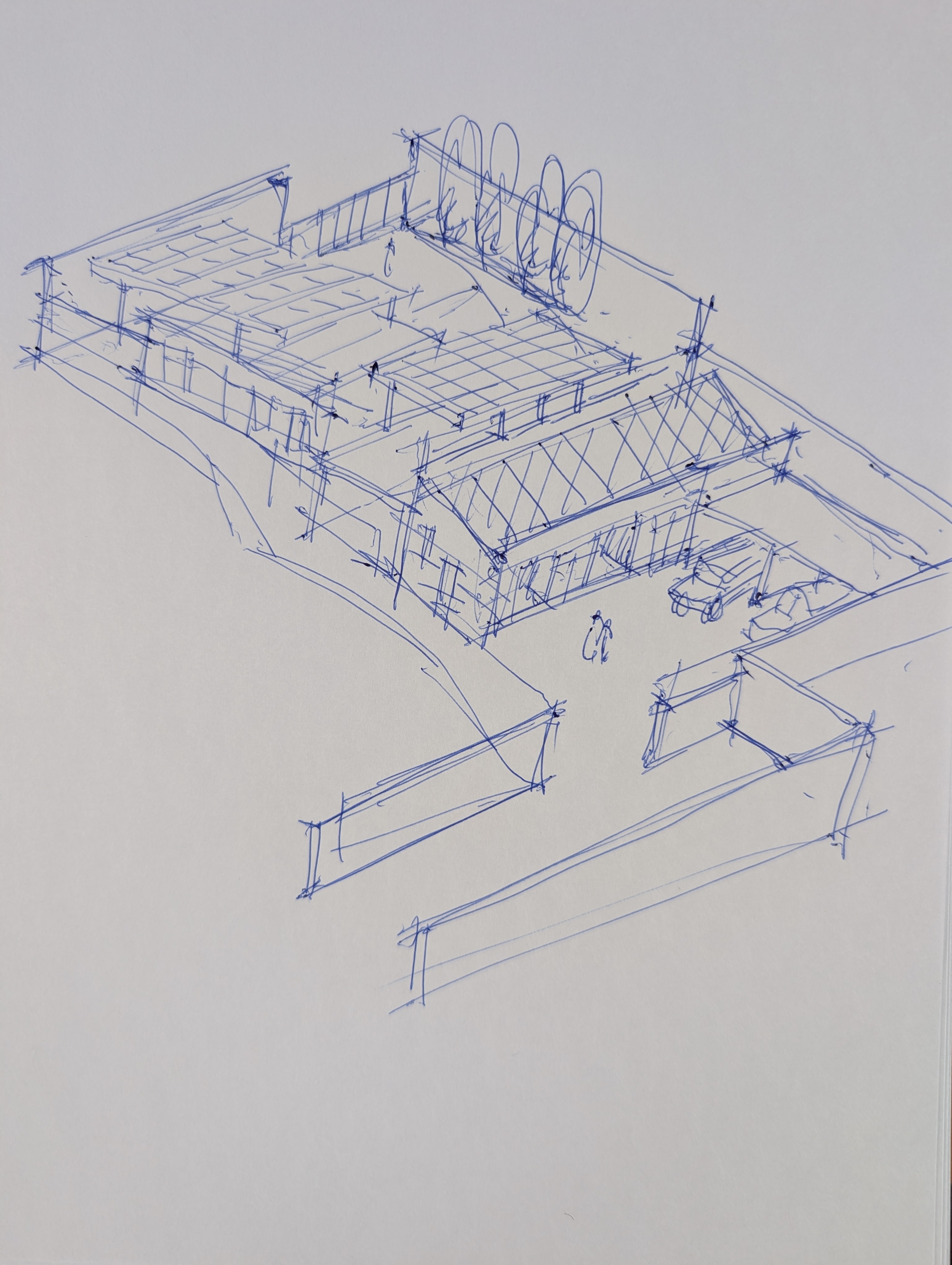 axonometric sketch of an architecture compound on a hilly site technical drawing style architect precision technical scale drawing detailed modern slick look