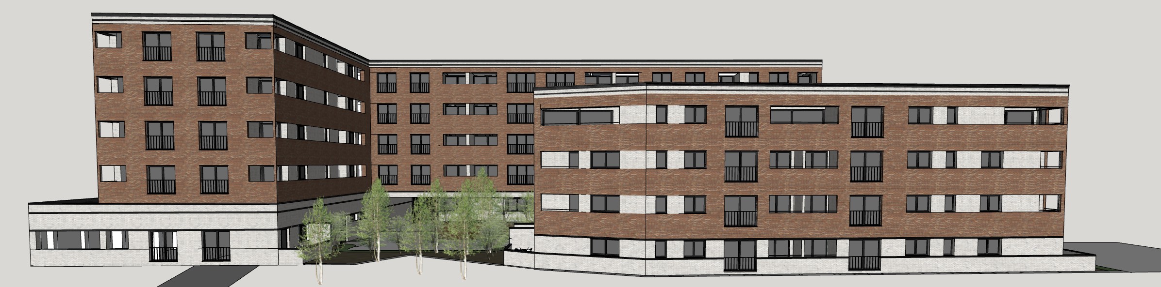 natural light and shadows in afternoon building facade is in bricks windows frames are satin black with reflections of other buildings in the window glass make more realistic vegetation