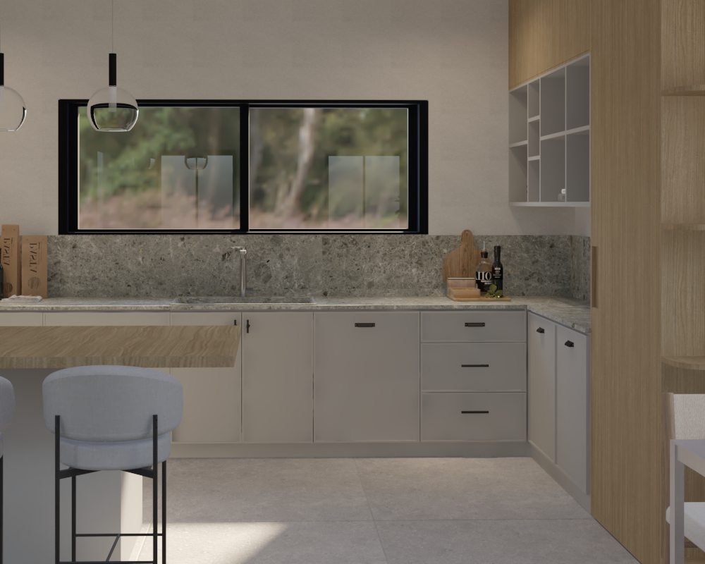 render a modern kitchen interior with a minimalistic design use light gray for the cabinets and soft tan for the wooden elements the countertop and backsplash should have a textured gray marble finish incorporate large rectangular windows with black frames allowing natural light to fill the space add subtle warm ambient lighting with sleek pendant lights featuring black accents place a couple of light gray bar stools in front of a light wood island maintain a serene and inviting atmosphere with muted neutral tones throughout