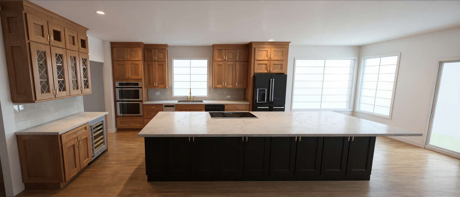 a modern public plaza with a sleek building in the background featuring beige walls and a wooden overhanging roof the scene is bustling with people engaging with the environment the sky is a clear bright blue with soft wispy clouds lush green trees and bushes surround the area adding a natural contrast the ground is paved with light gray tiles and a black stone path the atmosphere is lively yet serene captured in a sunny late afternoon glow
