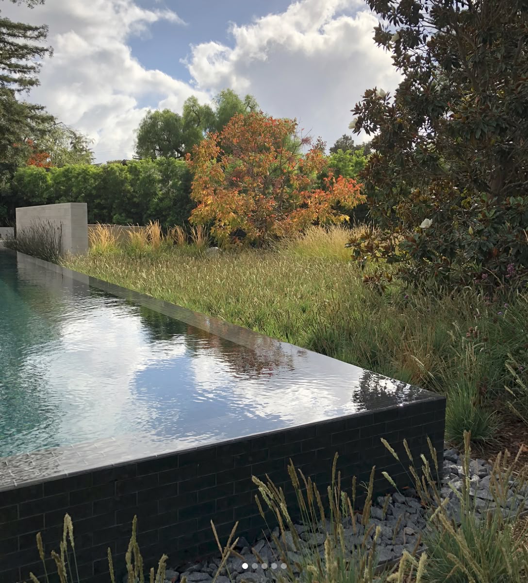 change all landscape to ricefields remove all trees to make ricefields until the horizon and under beautiful blue summer sky with white clouds the pool is clad with bali green andesite remove the white wall in the background and make it a timber pergola pavilion plants immediately near the pool are lush ferns in the foreground dark brown ulin wooden deck on the left that is level with the top of the pool the perspective is maintained same as the reference image