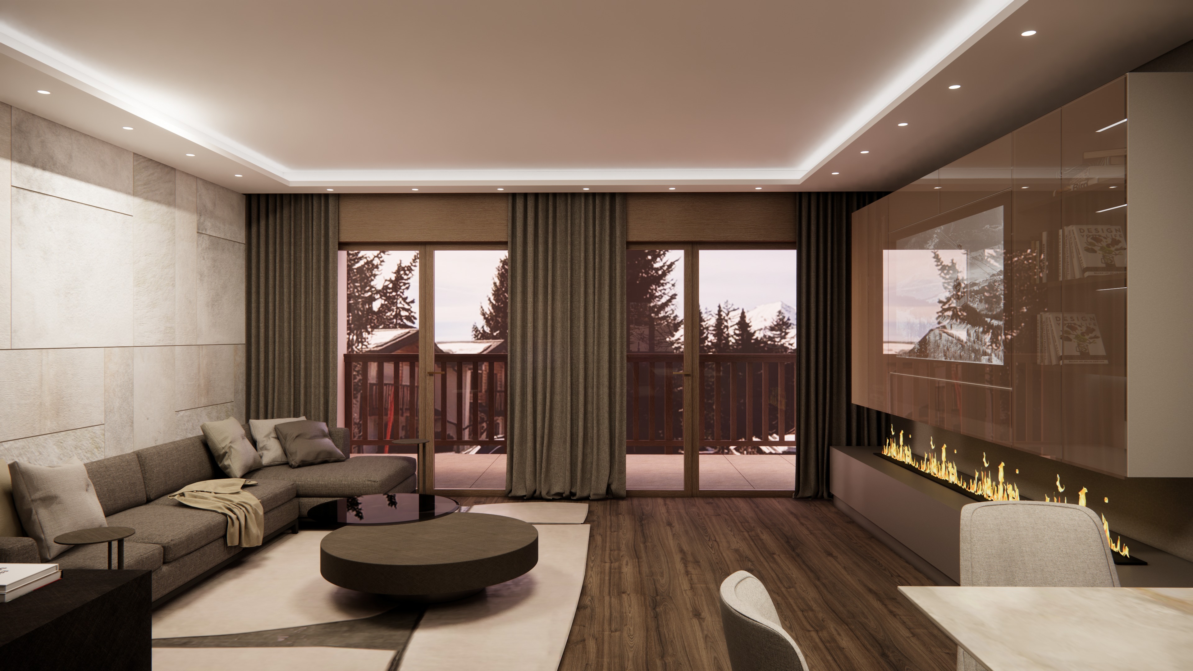 a modern living space featuring an open plan design with minimalist aesthetics the walls are adorned with a subtle geometric pattern in shades of light gray and cream creating a neutral yet sophisticated backdrop the staircase crafted from smooth light oak wood adds a touch of warmth to the space the dark hardwood floor enhances the cozy atmosphere the dining area showcases elegant charcoal gray chairs surrounding a sleek black table above a contemporary pendant light casts soft illumination adding to the intimate ambiance a large comfortable sofa in muted gray is complemented by plush pillows in varying tones of beige and soft white the artwork on the wall a depiction of a bare tree in golden hues provides a focal point and adds a touch of nature to the setting overall the atmosphere is serene modern and inviting