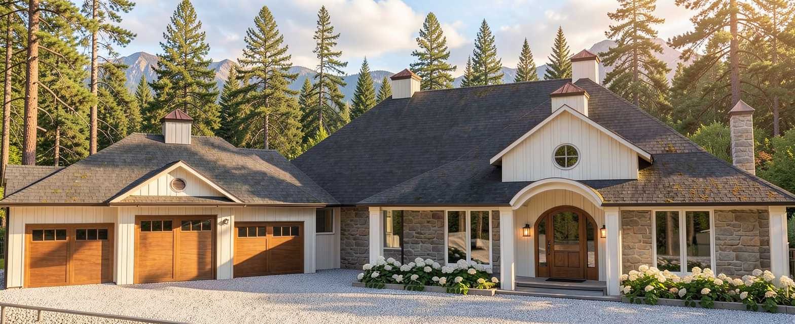 spring time afternoon harp lights black frames trees more realistic at the background show different height of trees inside the buildings show furniture the windows are darker the lights in landscape should be realistic and metal material show real lightings below the roof gables and landscape lights black shutters