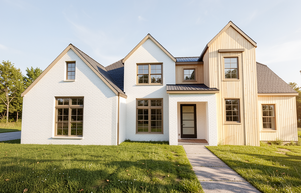 create a realistic scene make the brick a light beige make the vertical siding light wood color add plants that compliment the home