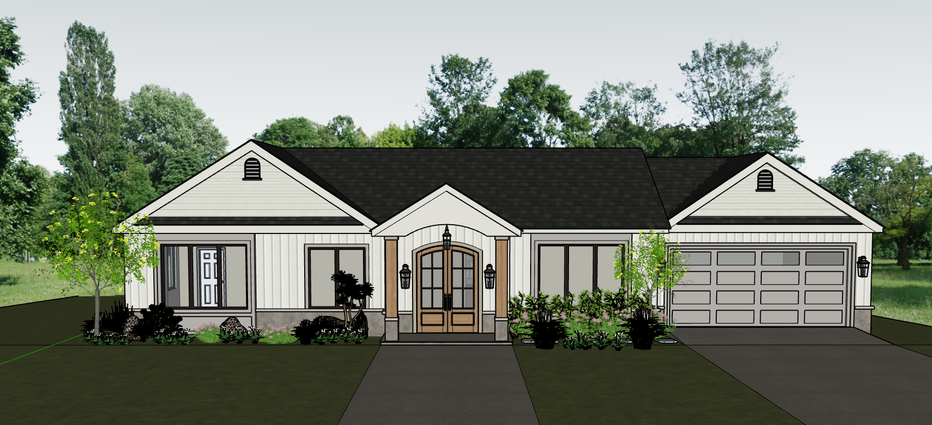 make this image look like a real photo keep the gable siding as a white straight shingle stack and keep the main siding vertical and a light tan in color keep the garage white and add windows