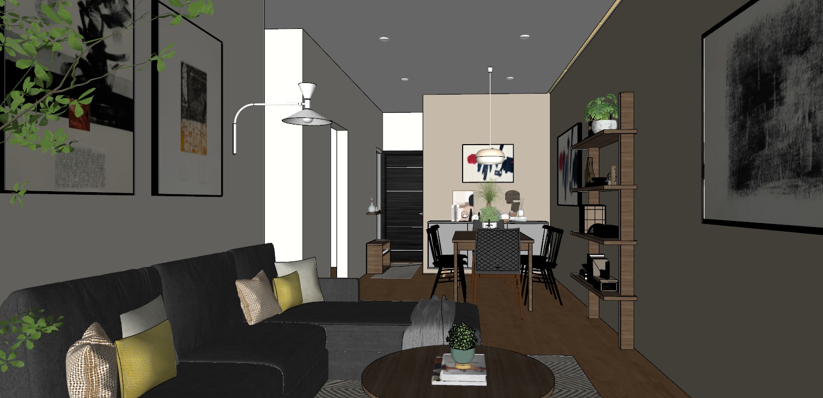 photorealistic interior render of a narrow contemporary apartment living dining space preserving all geometry furniture placement materials and camera setup exactly as defined critical lighting balance fix current error the current render is incorrect because lighting is too flat overexposed and lacks warm artificial presence the goal is daytime scene with clearly visible warm artificial lighting balanced contrast not flat not dramatic 1 daylight control it not dominant natural light enters from the left side must be soft and diffused overcast moderate intensity reduce current brightness it should not wash out the scene avoid overexposed walls pure white surfaces loss of contrast 2 ceiling spotlights bring them back all recessed spotlights must be on warm 3000k increase their intensity slightly compared to current render they must be clearly visible as active light sources create gentle pools of light on ceiling and floor add depth and contrast ahora mismo casi no se perciben eso est mal 3 led strip correct behavior key fix keep led strip on right ceiling on 3000k but correct its behavior it must produce a soft diffused glow not a sharp bright line slightly reduce intensity compared to previous version the one with wall wash it should light the ceiling edge subtly add warmth enhance depth very important it can softly affect the wall but only minimally no strong wall washing no vertical glow effect no bright streaks on the wall think ambient accent not feature lighting 4 remove current errors the current image must be corrected by removing overexposure restoring contrast reintroducing warm tones avoiding flat lighting 5 target look very clear intent the final render should feel like a real photograph taken during the day interior lights are on and visible warm neutral balance soft shadows defined depth not washed out all white flat cold 6 exposure control very important slightly lower overall exposure preserve highlight detail no clipping maintain midtone contrast keep natural dynamic range 7 final lighting relationship daylight base illumination spotlights visible and shaping space led subtle accent ninguna debe desaparecer ninguna debe dominar resumen clave para la ia esto es lo que la arregla reduce daylight intensity increase warm artificial lighting slightly remove flatness keep led subtle but visible restore contrast and depth