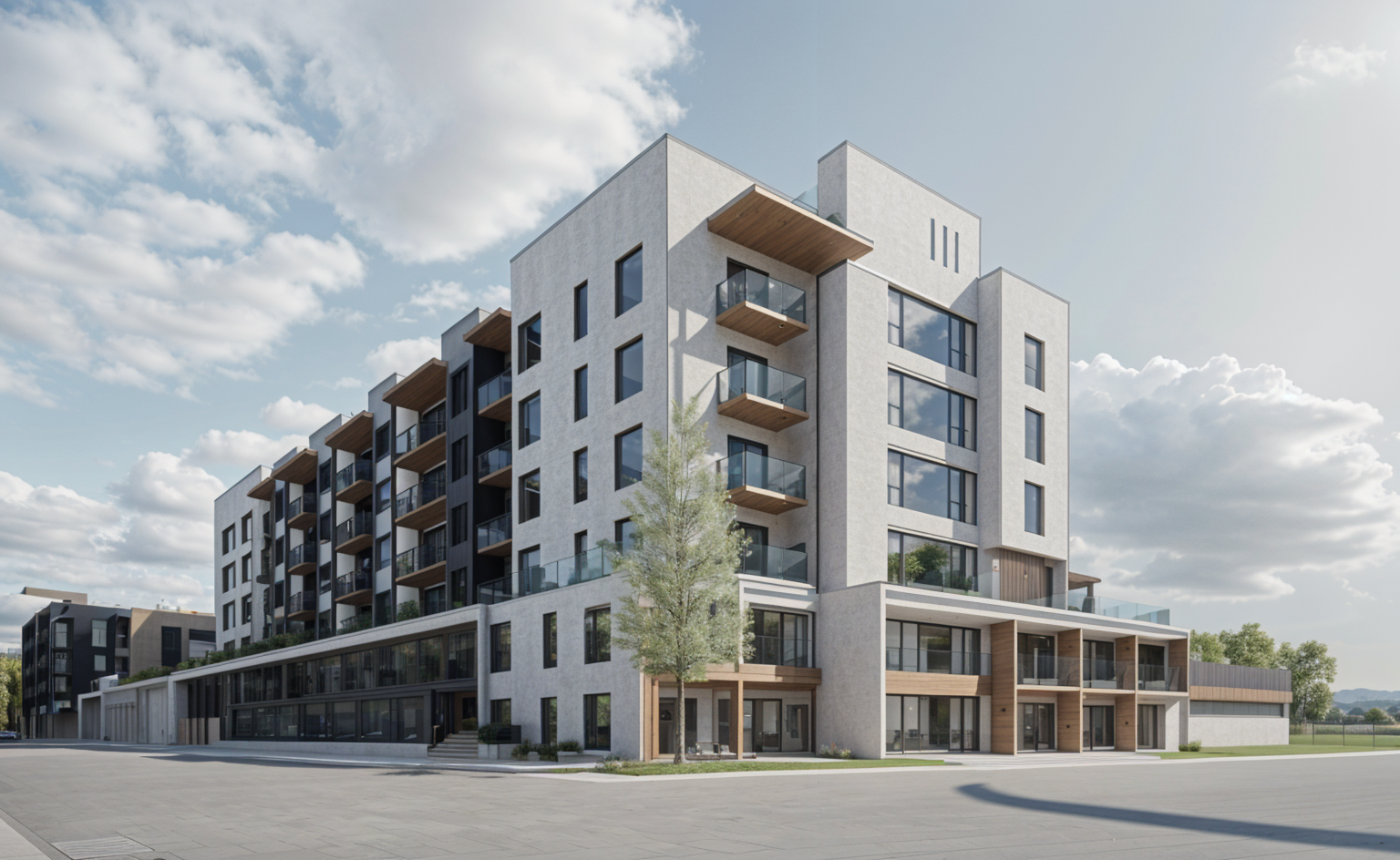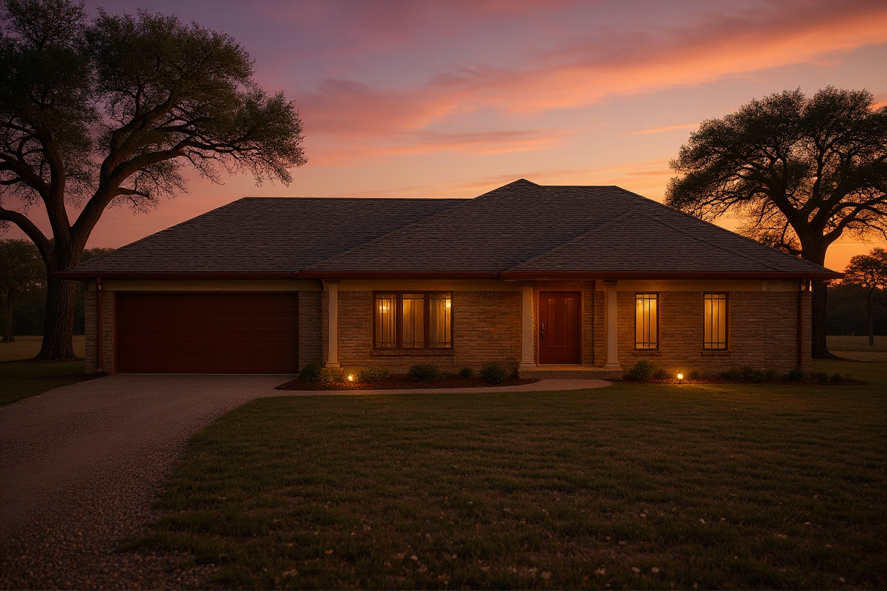 prairie style texas ranch land setting with foundation planting and wildflowers brown roman brick with cream color stucco band above no brick above windows cherokee red paint on doors windows fascia texas live oak trees in yard no step at front porch gravel drive to garage door sunset with lights on add large oak tree in front yard right side