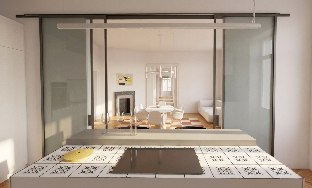 convert this floor plan into a realistic isometric 3d view of a full house show the space from an elevated angle with furniture walls and details visible elegant kitchen use the same furniture as shows on the plan do not change the orientation of the floorplan