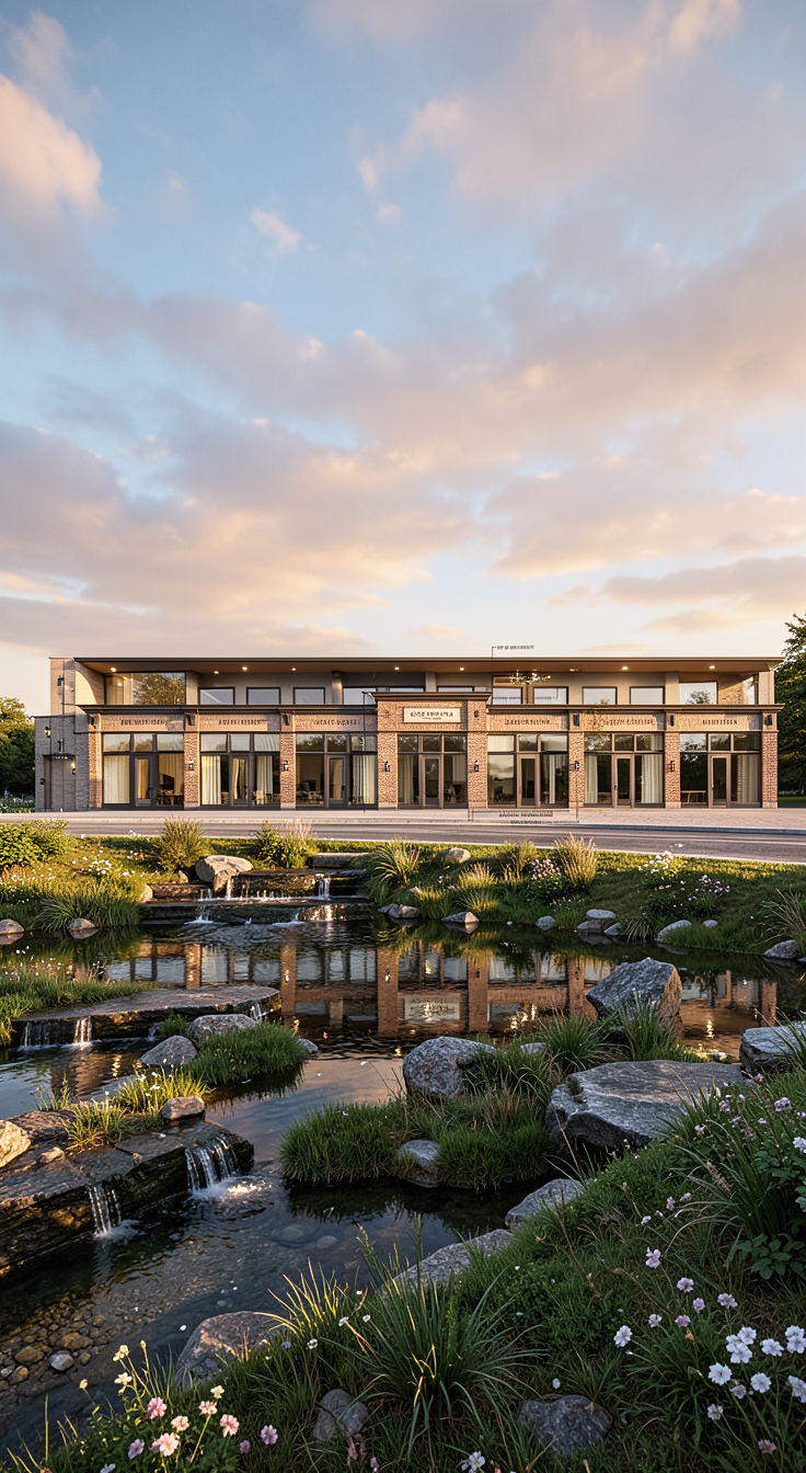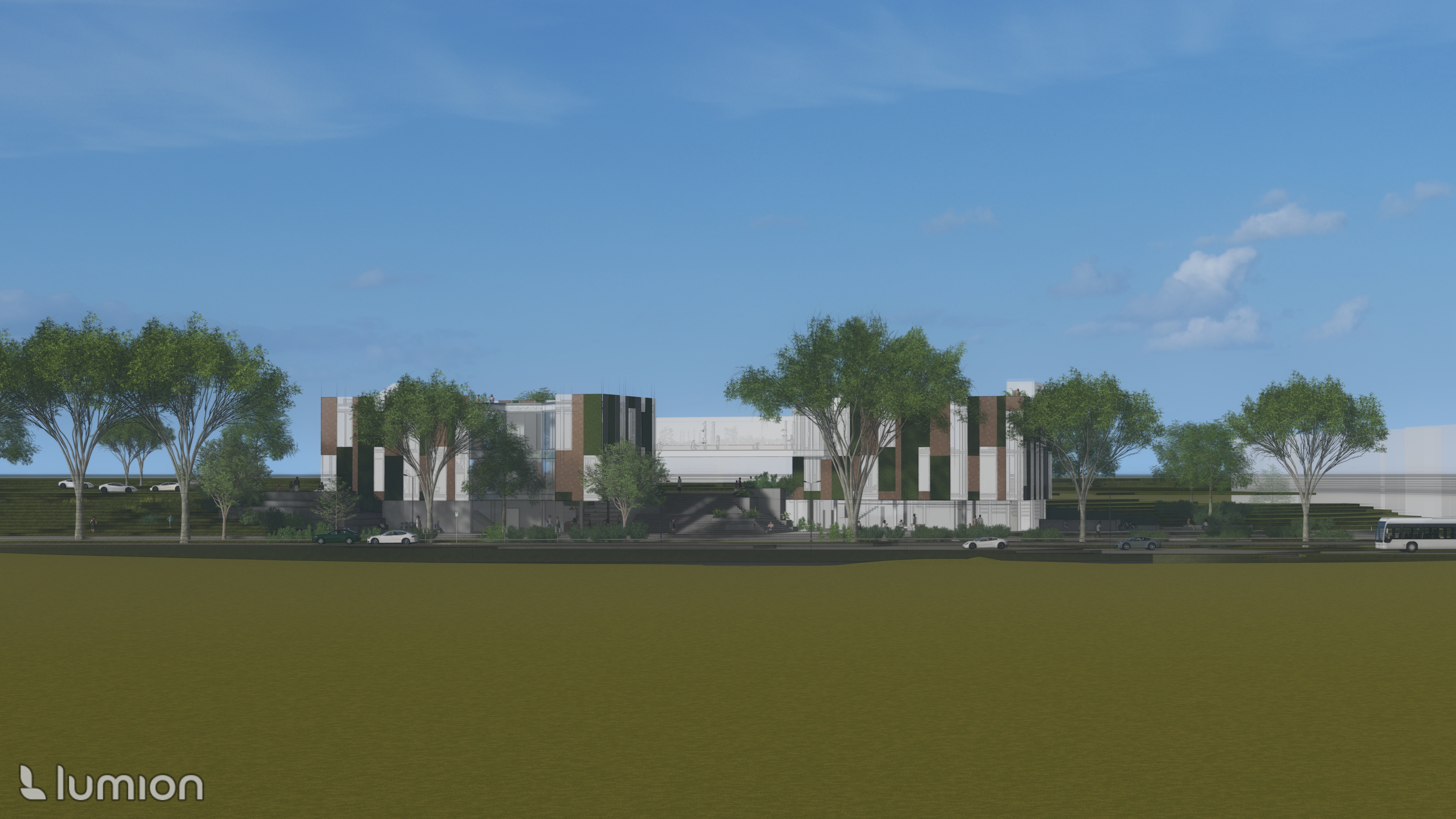 copy prompt make this into a flat 2d elevation drawing more outlines on the building less of a render quality my professors like a ground line with the building coming straight up from it no perspective view the image is from straight on and the buildings are slightly crooked desaturate the sky make it more of a plain blue watercolor texture make the trees outline light gray vector lines maintain the cars and people but make them match the rest of the style and put the cars at the ground line make the roofline flat maintain the colors on the building but change the opacity maintain the green panels on the building the rooftops are flat make the ground a thin line with no color underneath make the grass on the sides a lighter watercolor texture lighten the sky to a very light watercolor texture make clear vector lines