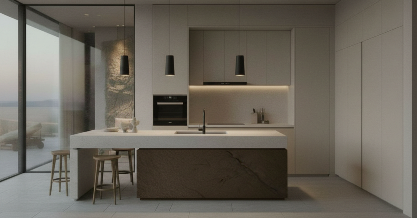 sunshine moderns style table electrodomestics white color and wood color in furniture and white tiles on the wall