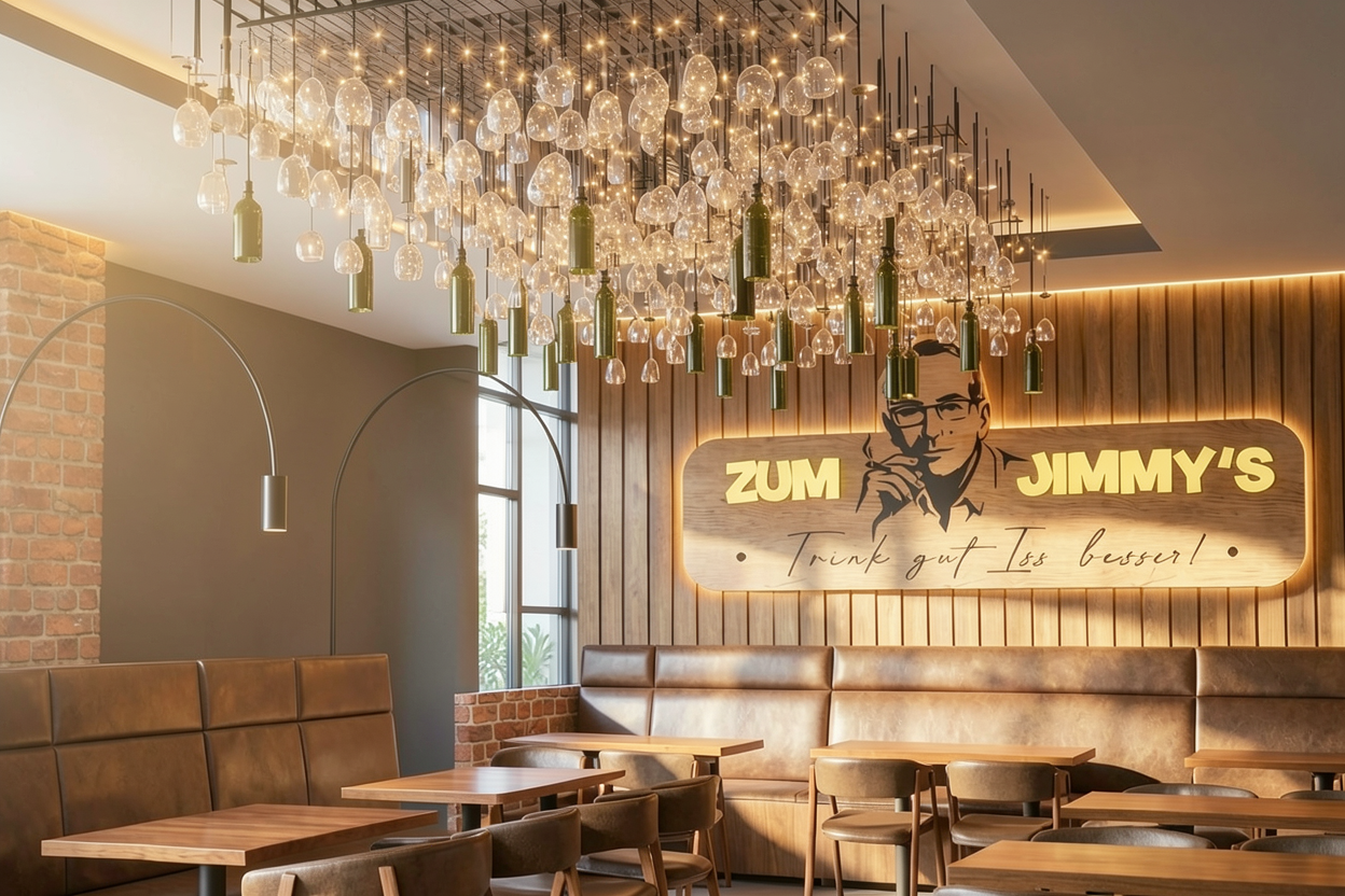strict image to image lighting adjustment only do not change anything except subtle daylight impact keep everything exactly as it is same composition same furniture same materials same logo same hanging wine glass and bottle installation same fairy lights same wall textures same geometry same perspective only change this add a very subtle warm late afternoon daylight influence coming from the unseen right side of the room important the window is not visible do not add any visible window do not add any opening or glass facade do not add visible sun rays or god rays do not add a bright sunlight beam do not brighten the whole image too much what the daylight should do only create a soft natural warm ambient daylight feeling slightly brighten the right facing surfaces add very soft realistic highlights on tables leather benches chairs floor wine glasses wine bottles add very subtle daylight reflections in the glass keep the overall mood warm elegant moody and realistic goal the image should look almost identical to the original with only the subtle impression that there is a large window somewhere outside the right side of the frame keep ceiling in black color negative instructions no redesign no new window no visible opening no sun beams no furniture changes no material changes no layout changes no composition changes no object movement no geometry changes