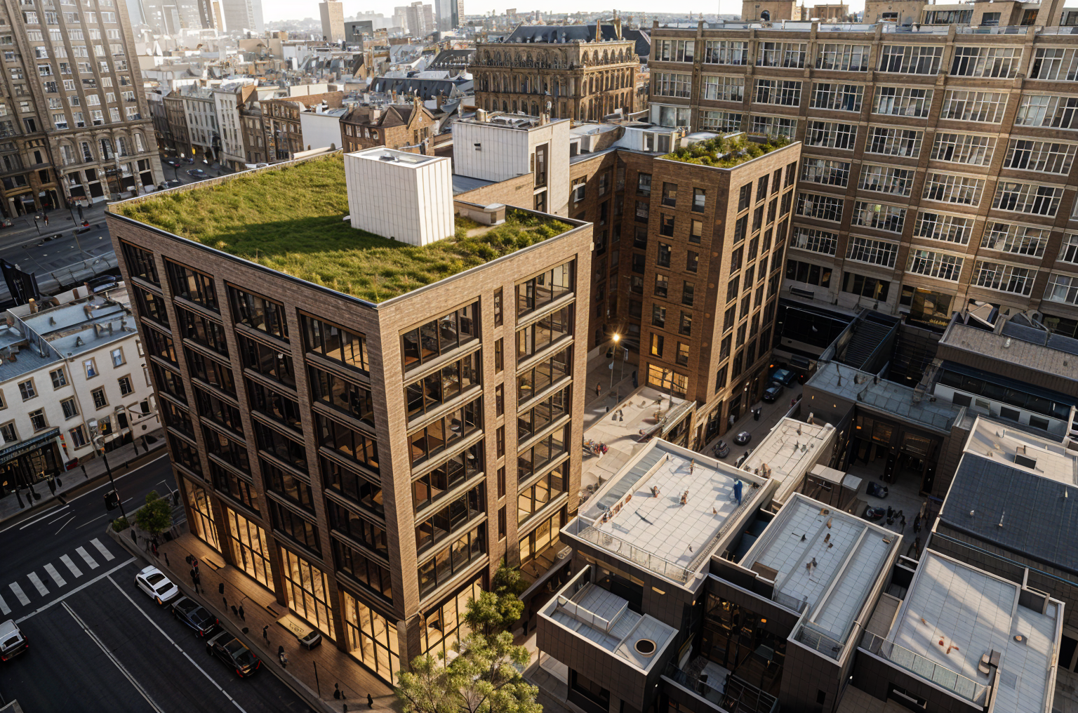 create hyperrealististic image of my architects design of two houses one house is flint and handmade clay roof the other is facing brickwork with black brick on edge details and clay roof add classy planting to front gardens and make the driveway a cream resin bound finish make it look classy and dont chmage the design or proportions add trees in the background and make all fences low black post and wire the grey house has a curved lead lined porch roof make sure the grey house has flint walls with red brick detaling as per the original image