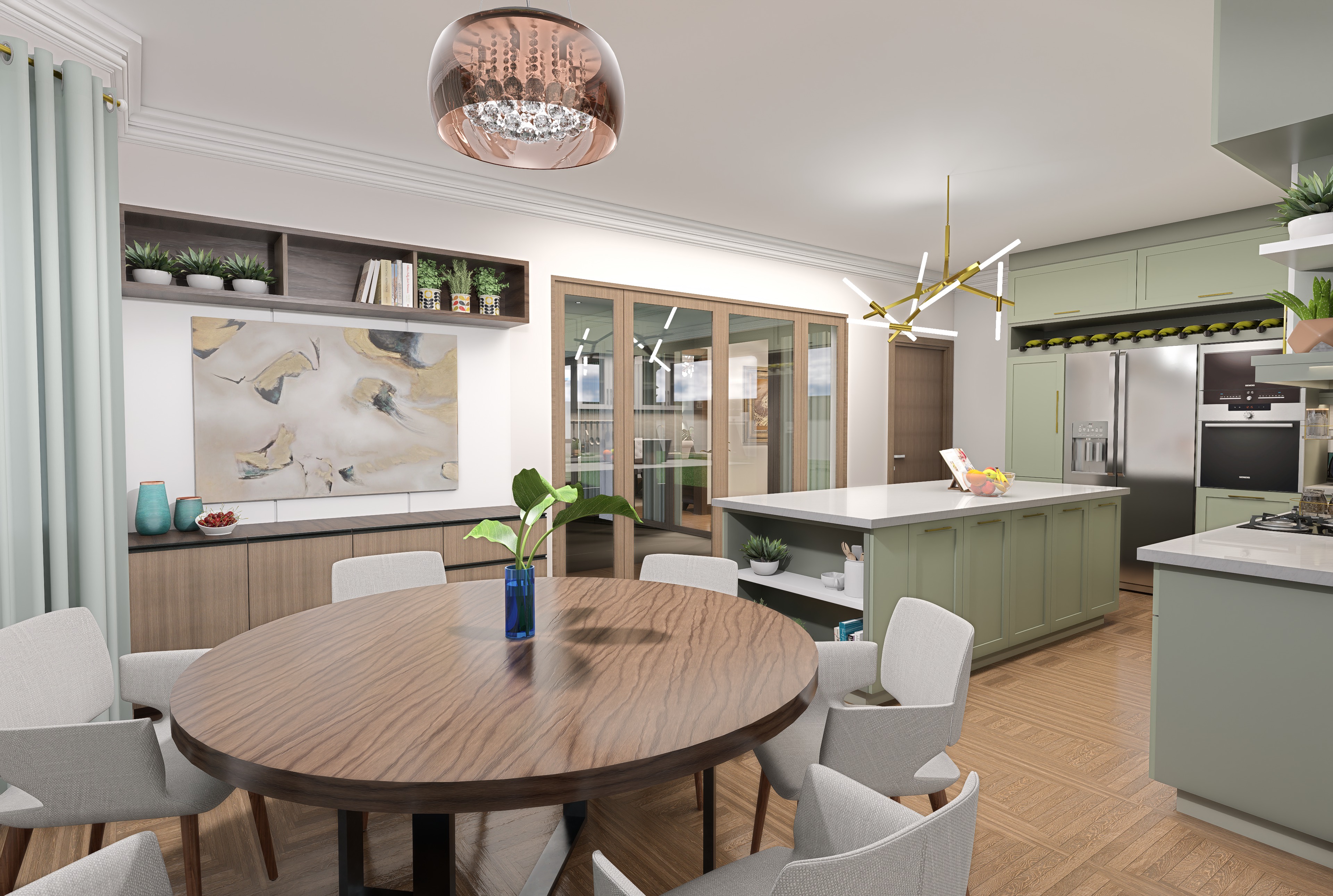 high end modern kitchen interior sage green shaker cabinets white quartz countertops golden hardware large kitchen island with open shelving contemporary gold branch chandelier herringbone walnut wood floor neutral walls with crown molding realistic lighting cinematic composition architectural photography style